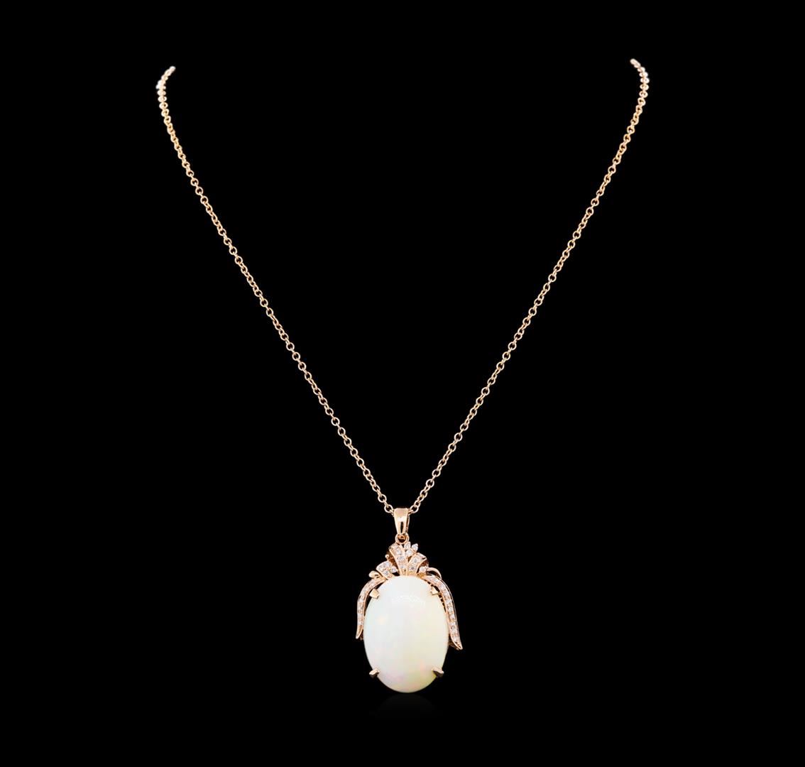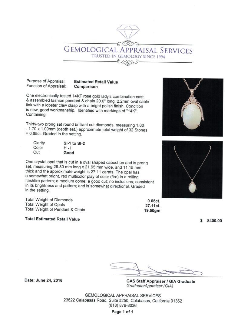 One electronically tested 14KT rose gold lady's combination cast & assembled fashion pendant & chain 20.0" long, 2.2mm oval cable link with a lobster claw clasp with a bright polish finish. Identified with markings of "14K". Condition is new, good workmanship. Containing: Thirty-Two prong set round brilliant cut diamonds, measuring 1.80 - 1.70 x 1.09mm (depth est.) approximate total weight of 32 Stones = 0.65ct. Graded in the setting. Clarity: SI-1 to SI-2. Color: H - I. Cut Good One crystal opal that is cut in a oval shaped cabochon and is prong set, measuring 29.80 mm long x 21.65 mm wide, and 11.15 mm thick and the approximate weight is 27.11 carats. The opal has a somewhat bright, red multicolor play of color (fire) in a rolling flashfire pattern; a medium dome; a good cut; no inclusions; consistent in its brightness and pattern; and is somewhat directional. Graded in the setting. Total Weight of Diamonds 0.65ct. Total Weight of Opals 27.11ct. Total Weight of Pendant & Chain 19.50gm. GAS Appraised at $8,400.00.