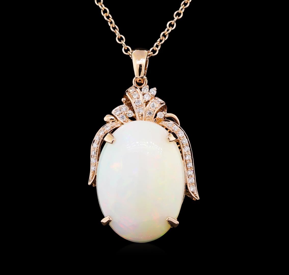 One electronically tested 14KT rose gold lady's combination cast & assembled fashion pendant & chain 20.0" long, 2.2mm oval cable link with a lobster claw clasp with a bright polish finish. Identified with markings of "14K". Condition is new, good workmanship. Containing: Thirty-Two prong set round brilliant cut diamonds, measuring 1.80 - 1.70 x 1.09mm (depth est.) approximate total weight of 32 Stones = 0.65ct. Graded in the setting. Clarity: SI-1 to SI-2. Color: H - I. Cut Good One crystal opal that is cut in a oval shaped cabochon and is prong set, measuring 29.80 mm long x 21.65 mm wide, and 11.15 mm thick and the approximate weight is 27.11 carats. The opal has a somewhat bright, red multicolor play of color (fire) in a rolling flashfire pattern; a medium dome; a good cut; no inclusions; consistent in its brightness and pattern; and is somewhat directional. Graded in the setting. Total Weight of Diamonds 0.65ct. Total Weight of Opals 27.11ct. Total Weight of Pendant & Chain 19.50gm. GAS Appraised at $8,400.00.