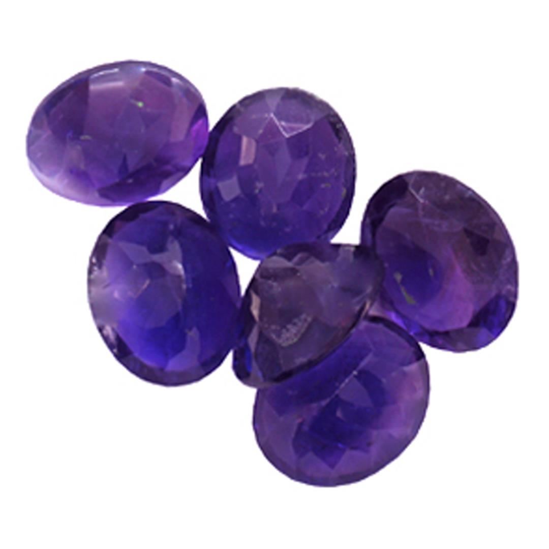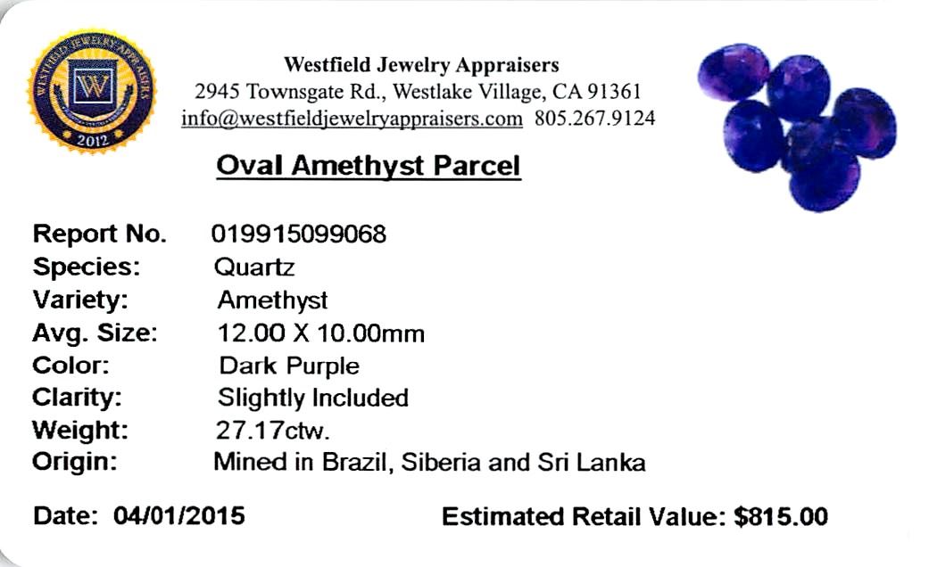 Six oval mixed cut natural amethysts exact total weight 27.17ct., clarity is slightly included, type II, dark, very slightly grayish, purple color, (GIA P 7/3), cut is good. Westfield Appraised at $815.00.