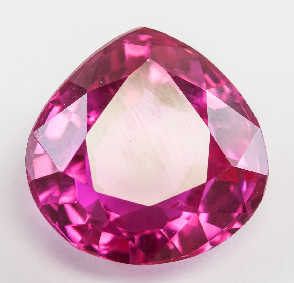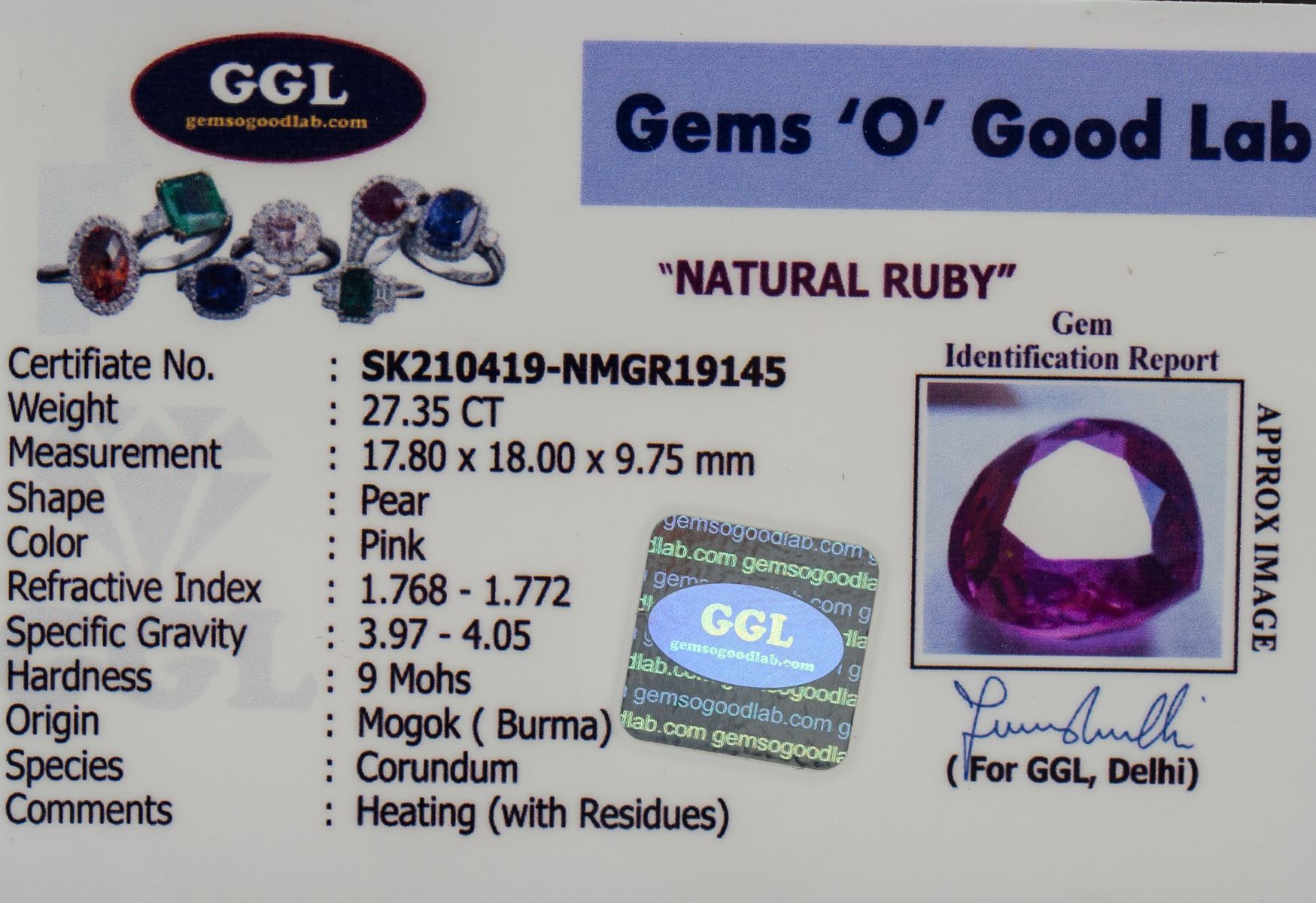 One (1) 27.35 ct pear cut pink natural ruby. Origin: Mogok (Burma). Accompanied with GGL certificate. 17.80 x 18.00 x 9.75 mm.