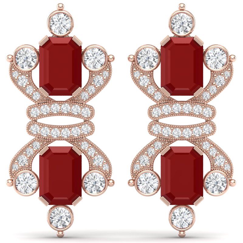 27.36 CTW Royalty Designer Ruby & VS Diamond Earrings 18K Rose Gold ---- Luxury Designer Brand Earring Appraised Retail Price at $52,800 ---- SKU Number US38764 18K Rose gold Earring Size is 45 Millimeter long, Earring measuring approx. 2 x 1 Inches, weighing in total approx. 19 grams. Made in the USA and is stamped 18K, Main stone 23.12 carat total weight containing 4 pieces of Intense Mid-Opaque Red color with AAA quality Emerald Cut shape cut Ruby , Stone #2 4.24 carat total weight containing 68 pieces of G-H color with VS/SI quality Round shape cut