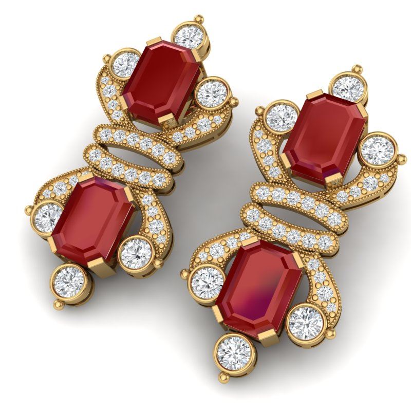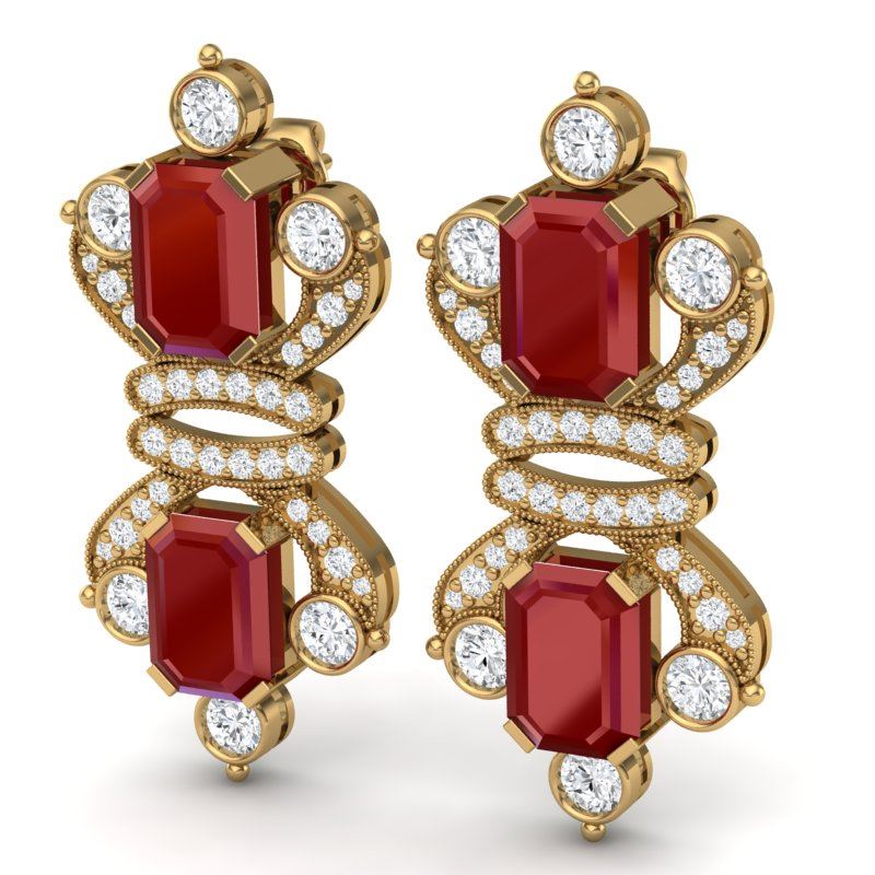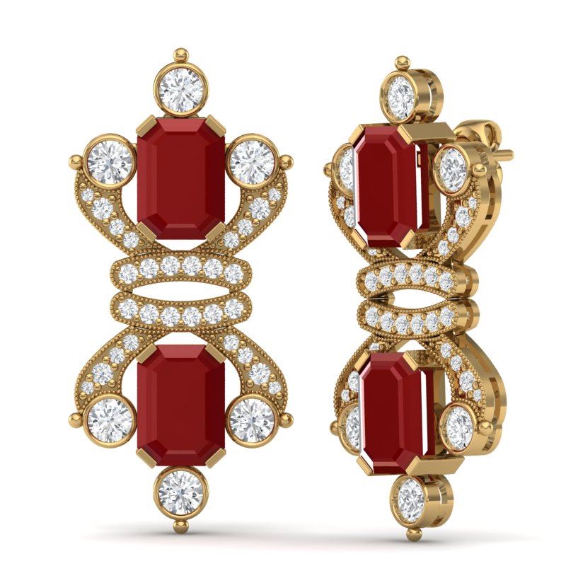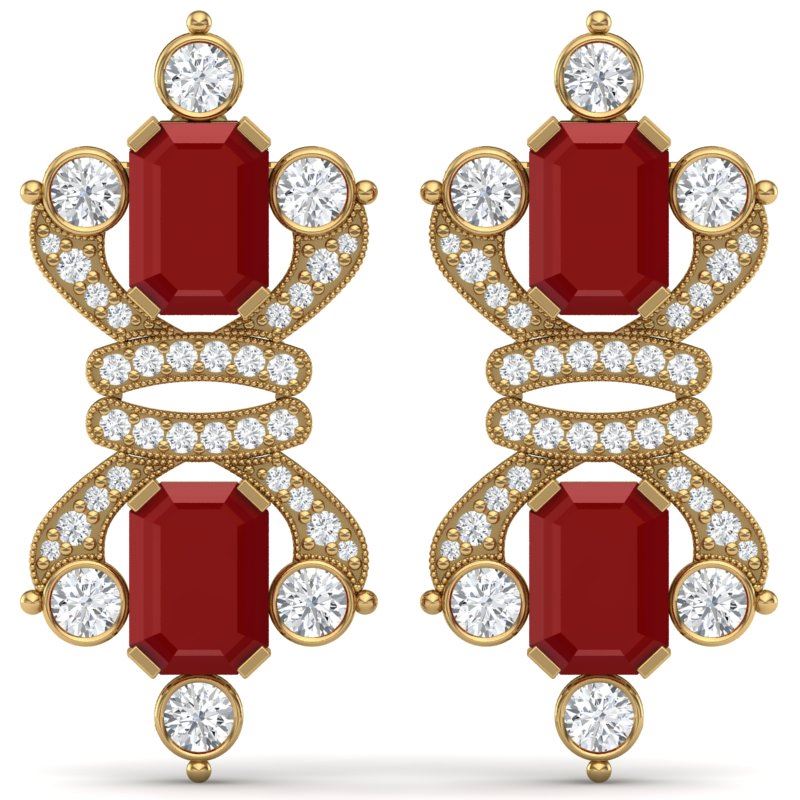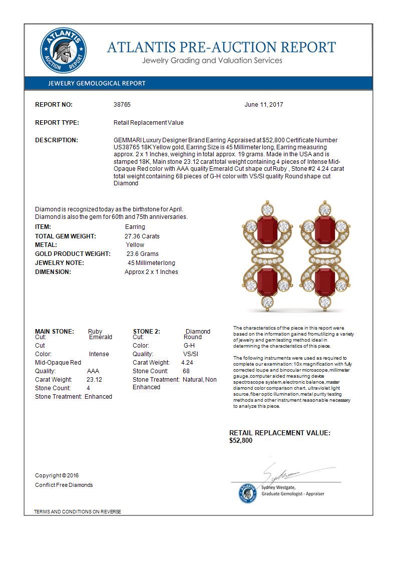 27.36 CTW Royalty Designer Ruby & VS Diamond Earrings 18K Yellow Gold ---- Luxury Designer Brand Earring Appraised Retail Price at $52,800 ---- SKU Number US38765 18K Yellow gold Earring Size is 45 Millimeter long, Earring measuring approx. 2 x 1 Inches, weighing in total approx. 19 grams. Made in the USA and is stamped 18K, Main stone 23.12 carat total weight containing 4 pieces of Intense Mid-Opaque Red color with AAA quality Emerald Cut shape cut Ruby , Stone #2 4.24 carat total weight containing 68 pieces of G-H color with VS/SI quality Round shape cut