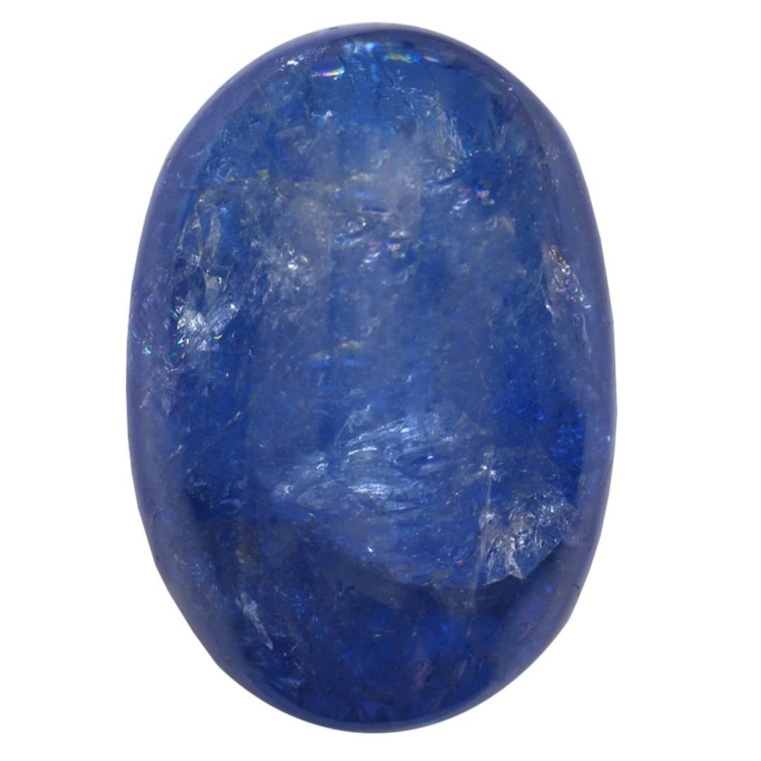 One oval cut natural tanzanite, measuring 23.00 x 15.80 x 8.20mm, exact weight 27.36ct., clarity is heavily included, type I, dark, very slightly grayish, blue color, (GIA B 7/3), cut is good. Transmitting light somewhat diffusely, transparent to translucent. Naturally occurring internal & external characteristics are present. Indications of heat treatment. Westfield Appraised at $2,625.00.