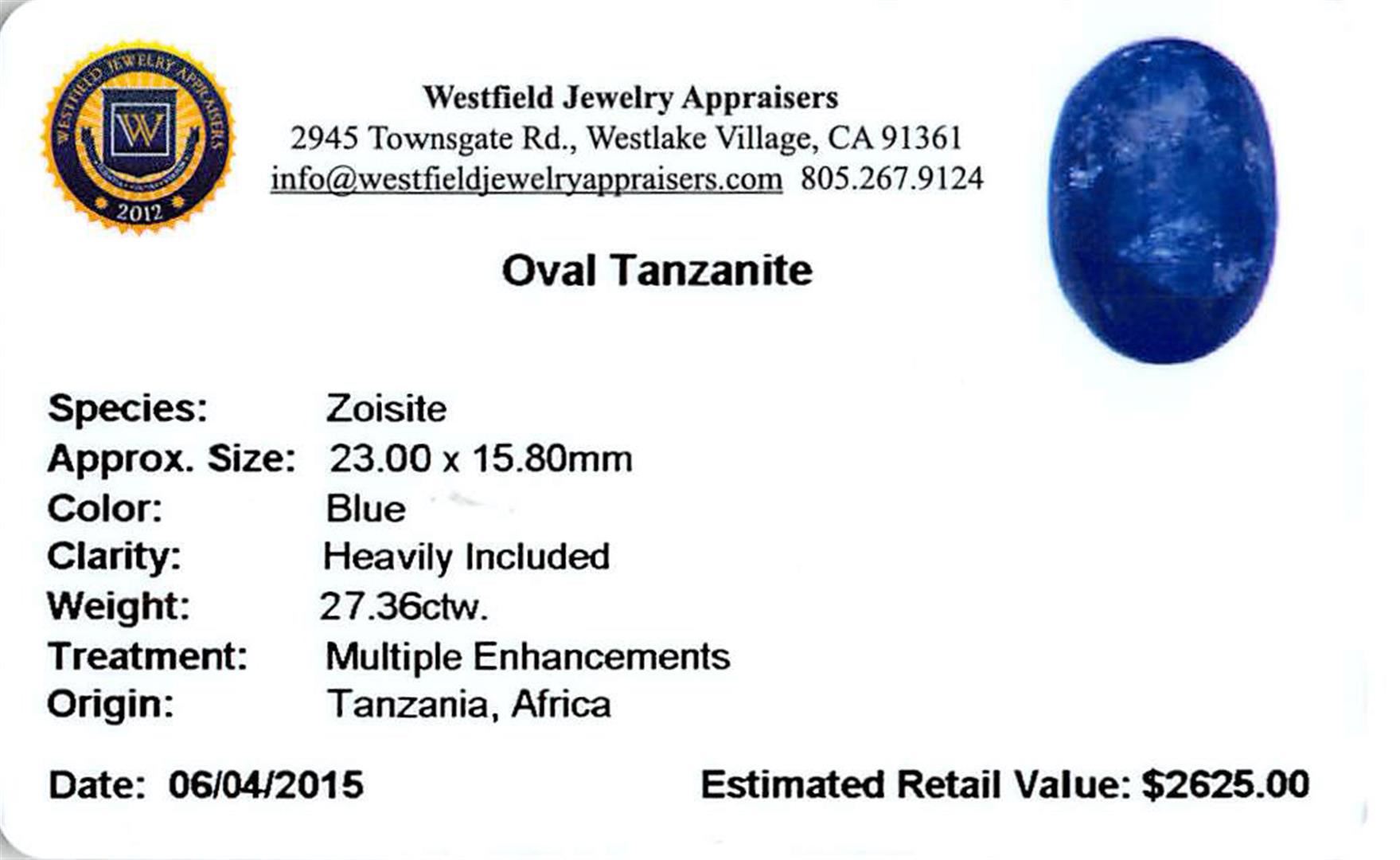 One oval cut natural tanzanite, measuring 23.00 x 15.80 x 8.20mm, exact weight 27.36ct., clarity is heavily included, type I, dark, very slightly grayish, blue color, (GIA B 7/3), cut is good. Transmitting light somewhat diffusely, transparent to translucent. Naturally occurring internal & external characteristics are present. Indications of heat treatment. Westfield Appraised at $2,625.00.