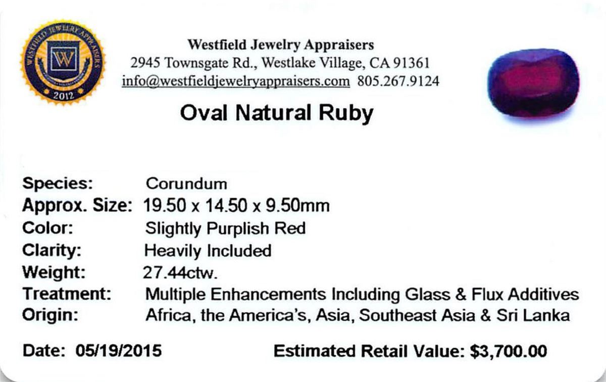 One oval mixed cut natural ruby, measuring 19.50 x 14.50 x 9.50mm, exact weight 27.44ct., clarity is heavily included, type II, dark, very slightly brownish, slightly purplish red color, (GIA slpR 7/3), cut is good. Transmitting light somewhat diffusely, transparent to translucent. Naturally occurring internal & external characteristics are present. Indications of laboratory high temperature heat treatment, with glass & flux additives. Ruby has a low tolerance to rhodium plating, repolishing the surface, & ultrasonic cleaning. Westfield Appraised at $3,700.00.