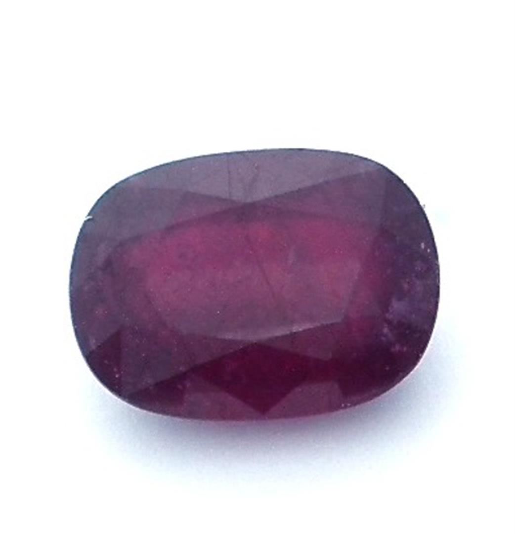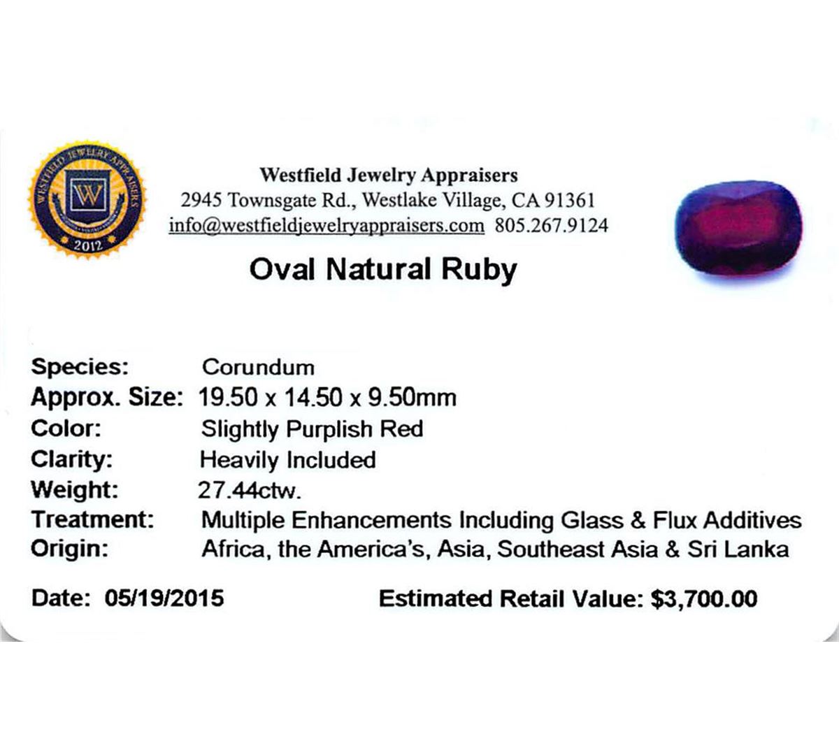 One oval mixed cut natural ruby, measuring 19.50 x 14.50 x 9.50mm, exact weight 27.44ct., clarity is heavily included, type II, dark, very slightly brownish, slightly purplish red color, (GIA slpR 7/3), cut is good. Transmitting light somewhat diffusely, transparent to translucent. Naturally occurring internal & external characteristics are present. Indications of laboratory high temperature heat treatment, with glass & flux additives. Ruby has a low tolerance to rhodium plating, repolishing the surface, & ultrasonic cleaning. Westfield Appraised at $3,700.00.