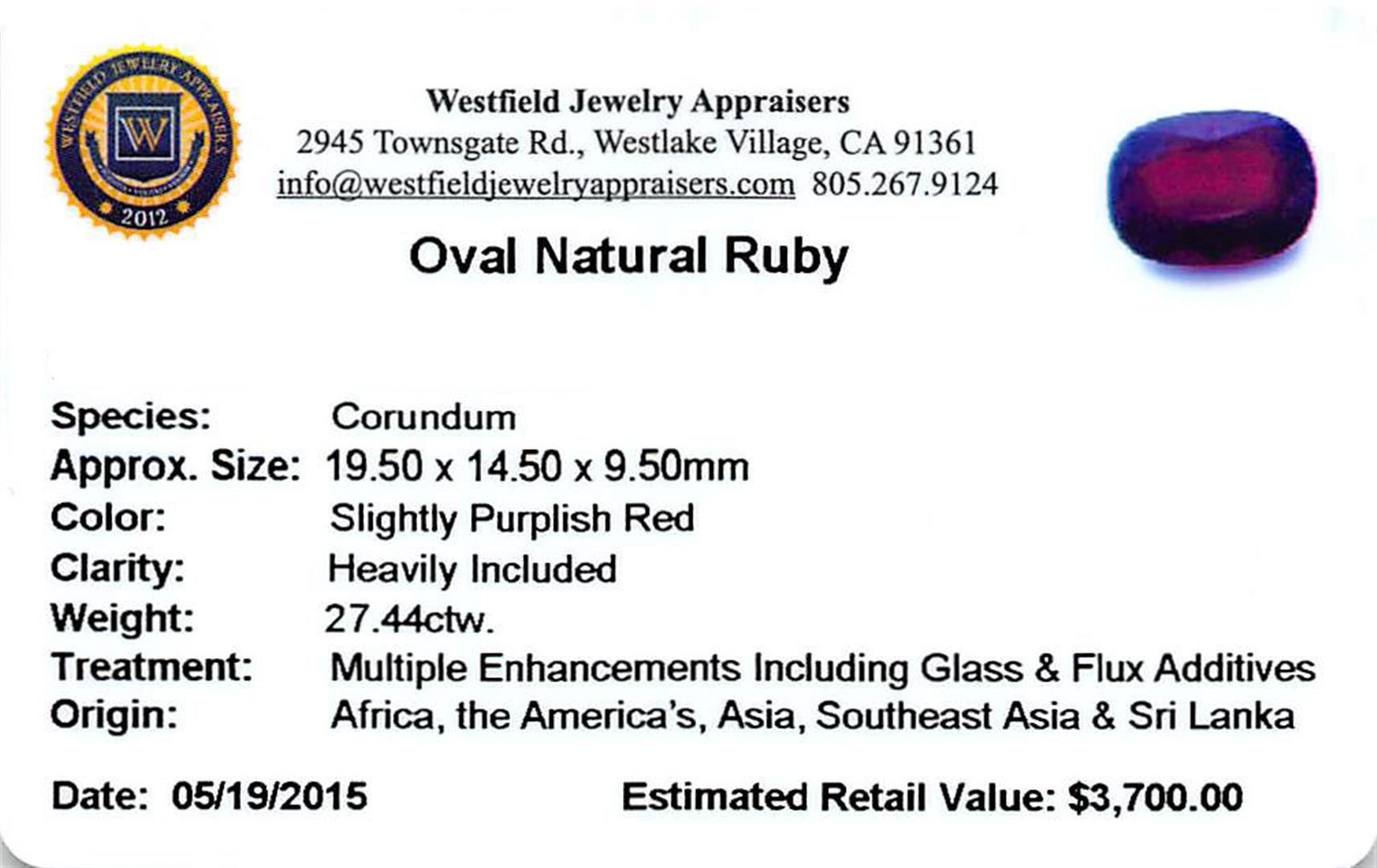 One oval mixed cut natural ruby, measuring 19.50 x 14.50 x 9.50mm, exact weight 27.44ct., clarity is heavily included, type II, dark, very slightly brownish, slightly purplish red color, (GIA slpR 7/3), cut is good. Transmitting light somewhat diffusely, transparent to translucent. Naturally occurring internal & external characteristics are present. Indications of laboratory high temperature heat treatment, with glass & flux additives. Ruby has a low tolerance to rhodium plating, repolishing the surface, & ultrasonic cleaning. Westfield Appraised at $3,700.00.