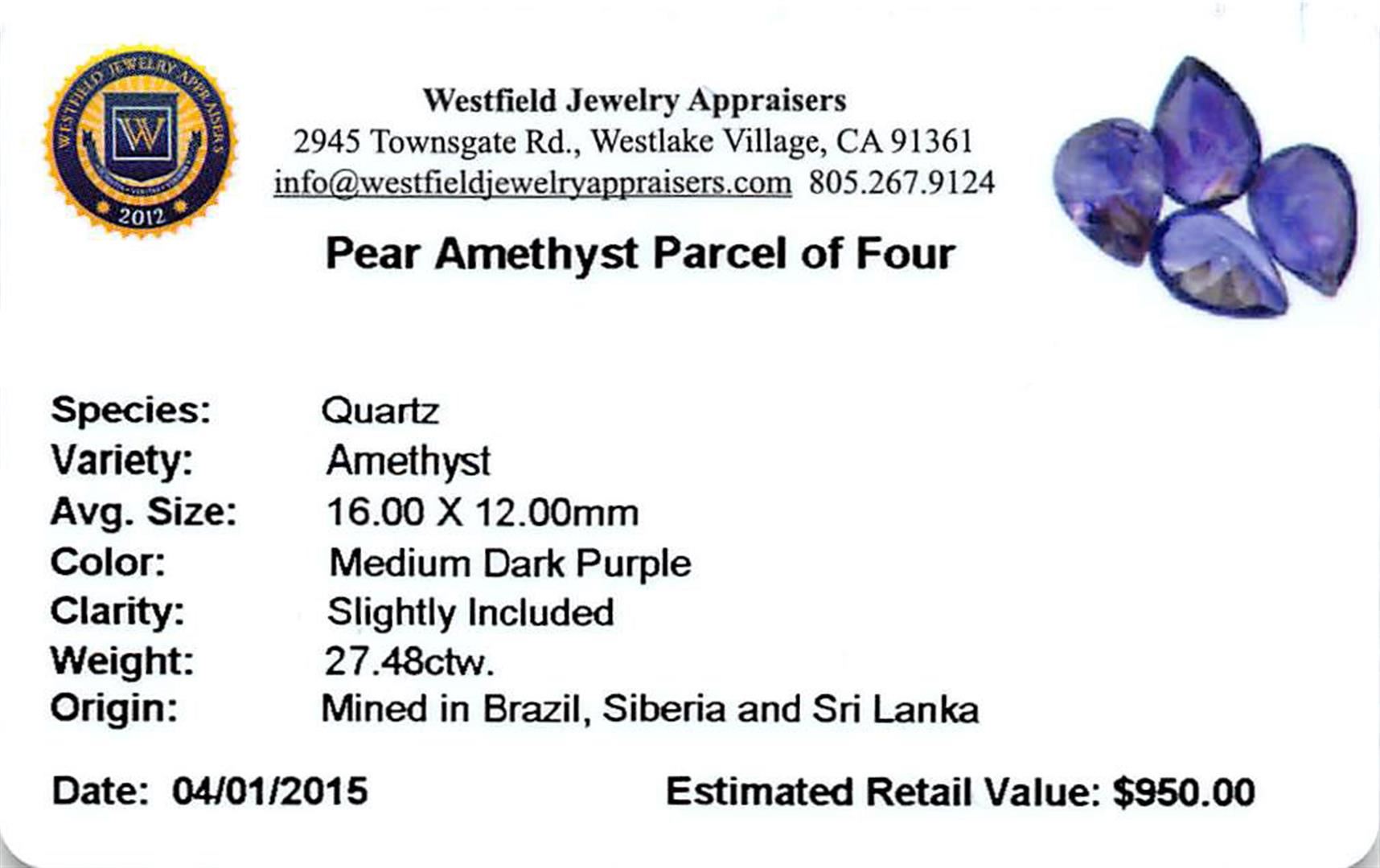 Four pear mixed cut natural amethysts exact total weight 27.48ct., clarity is slightly included, type II, medium dark, very slightly grayish, purple color, (GIA P 6/3), cut is good. Westfield Appraised.