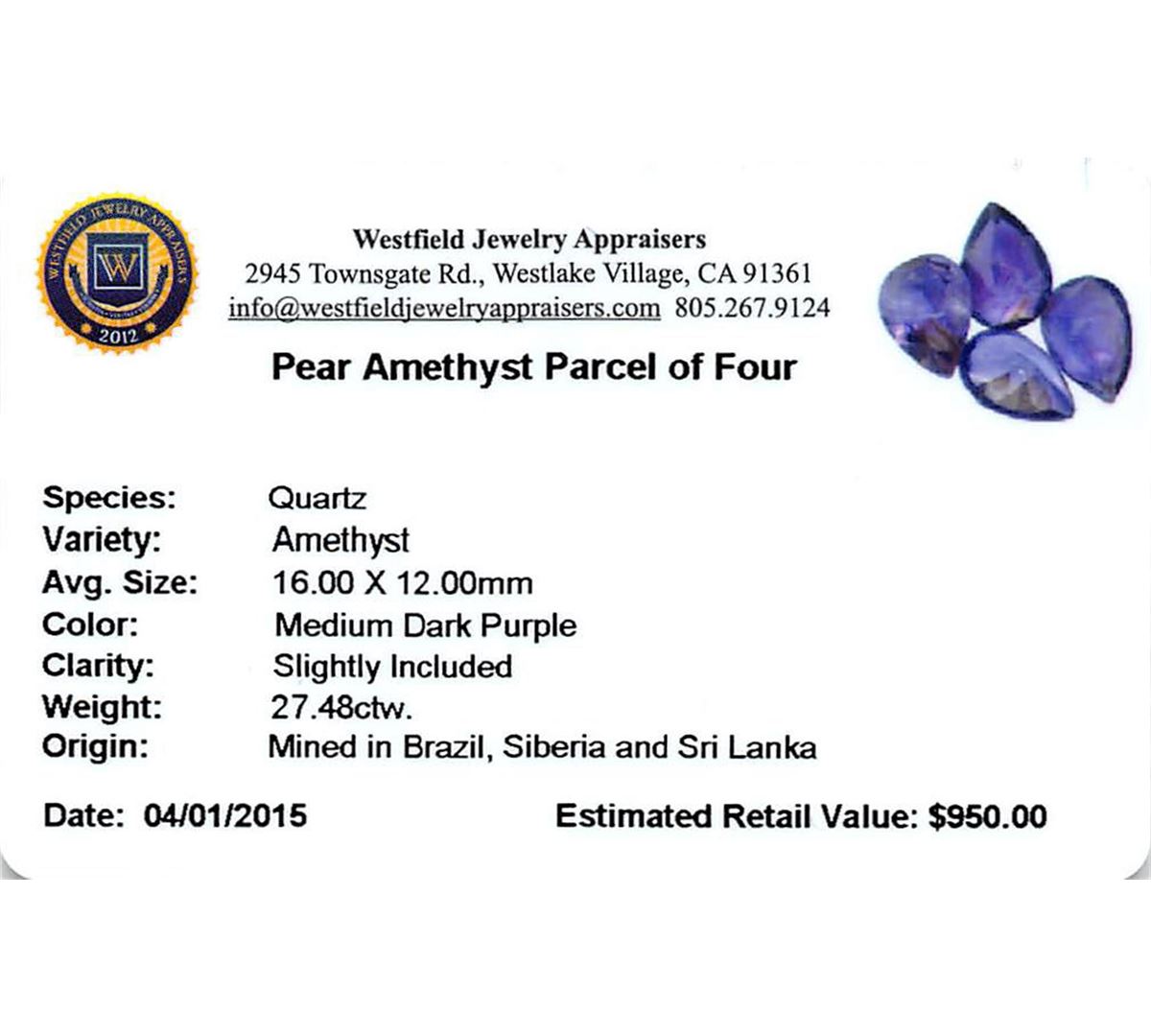 Four pear mixed cut natural amethysts exact total weight 27.48ct., clarity is slightly included, type II, medium dark, very slightly grayish, purple color, (GIA P 6/3), cut is good. Westfield Appraised at $950.00.