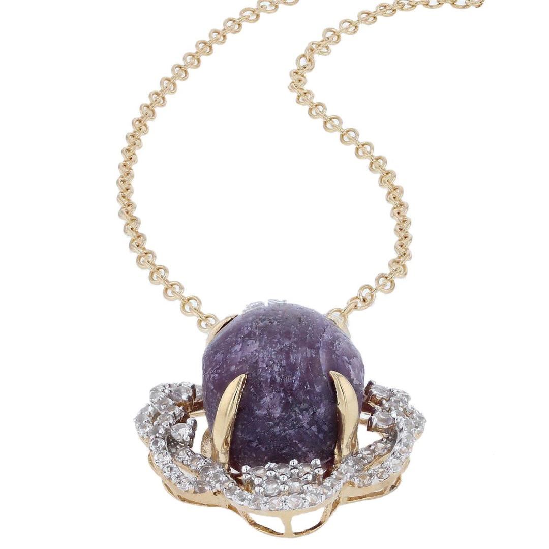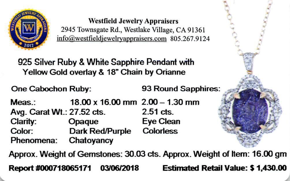 Electronically tested 925 silver with gold overly, ladies cast & assembled ruby and sapphire pendant with 18†chain. Trademark is Orianne. Identified with markings of "925". Condition is new, good workmanship. Containing: One prong set oval cabochon cut natural ruby with Chatoyancy phenomena, measuring 18.00 x 16.00 x 8.00mm, approximate weight of 27.52ct., type II, dark, brownish, strongly purplish red color, (GIA stpR 7/1), cut is good.. Ninety-three prong set round mixed cut natural white sapphires, measuring 2.00 - 1.30 x 1.07 mm, approximate total weight of 2.51ct., clarity is eye clean, colorless, very slightly grayish, white color, (GIA W 0/3), cut is good. Total Weight of Colored Stones 30.03 ct. Total Weight of Pendant With Chain 16.00 gm