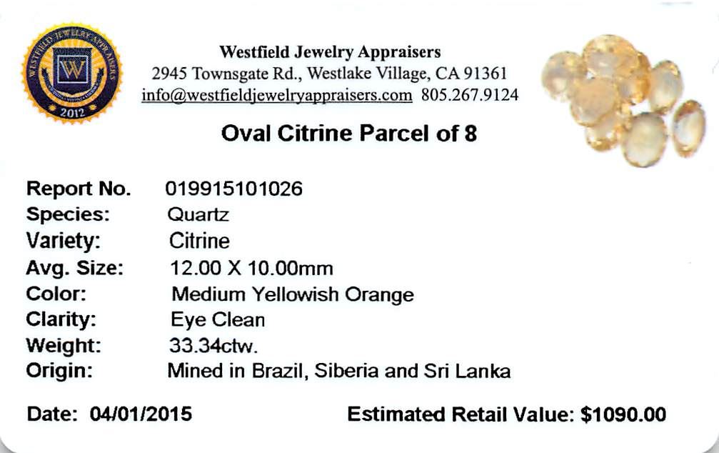 Six oval mixed cut natural citrine quartzs exact total weight 27.52ct., clarity is eye clean, type I, medium, slightly brownish, yellowish orange color, (GIA yO 5/2), cut is good. Westfield Appraised at $900.00.