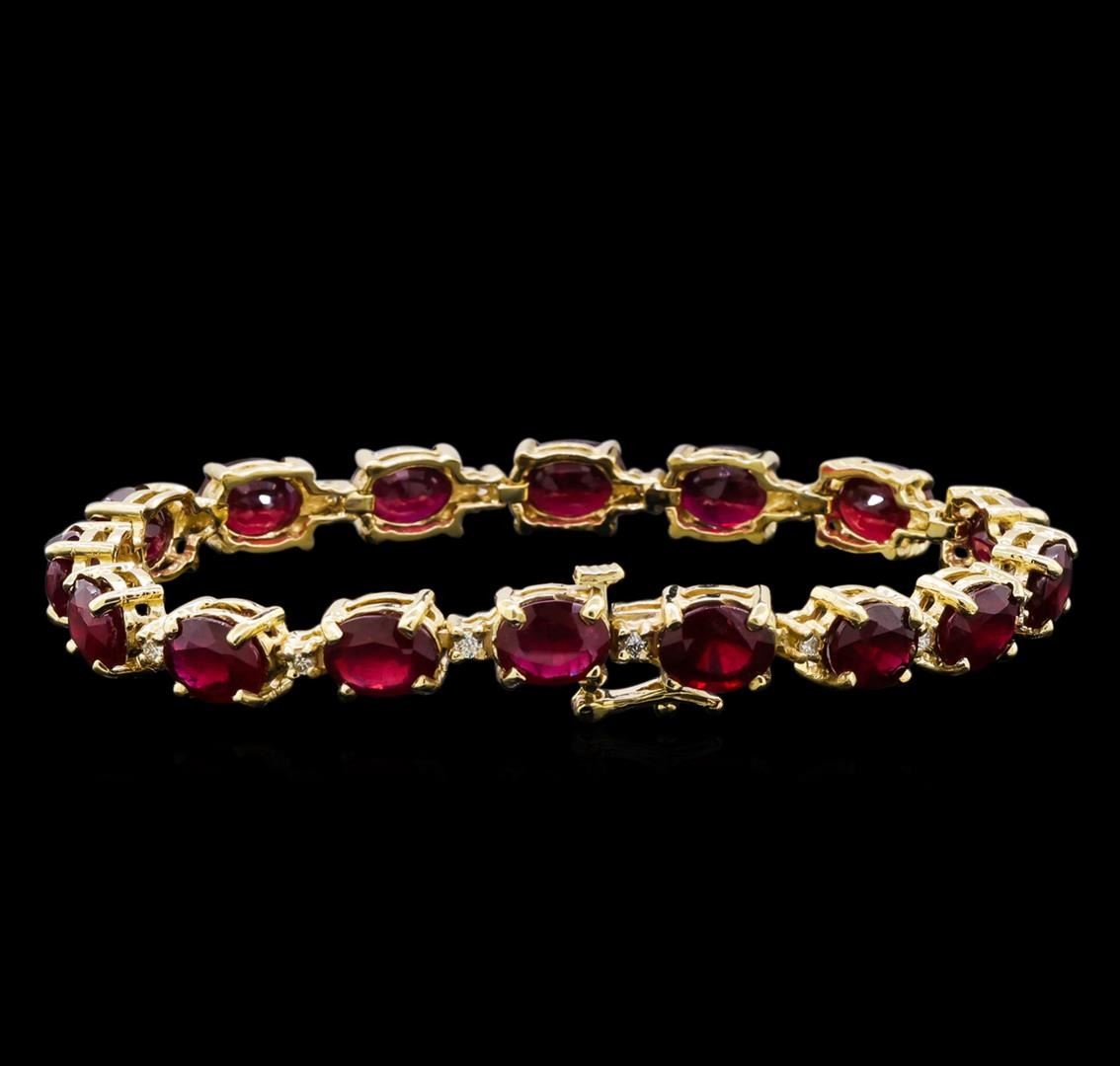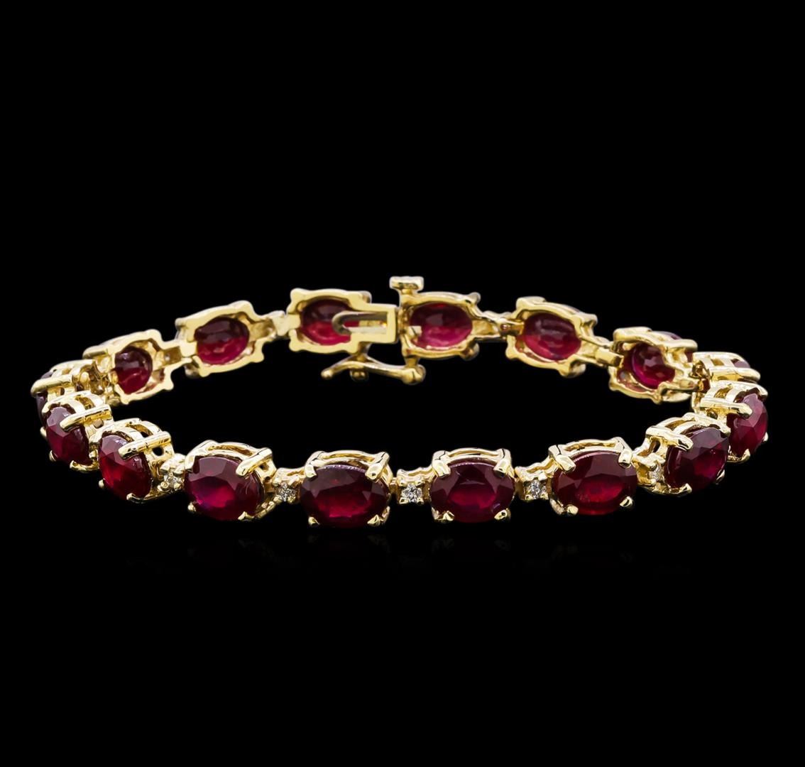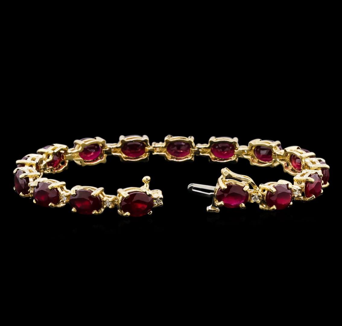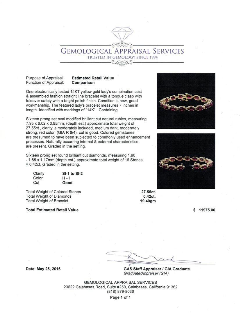 One electronically tested 14KT yellow gold lady's combination cast & assembled fashion straight line bracelet with a tongue clasp with foldover safety with a bright polish finish. The featured lady's bracelet measures 7 inches in length. Identified with markings of "14K". Condition is new, good workmanship. Containing: Sixteen prong set oval modified brilliant cut natural rubies, measuring 7.95 x 6.02 x 3.95mm, (depth est.) approximate total weight of 27.55ct., clarity is moderately included, medium dark, moderately strong, red color, (GIA R 6/4), cut is good. Colored gemstones are presumed to have been subjected to commonly used enhancement processes. Naturally occurring internal & external characteristics are present. Graded in the setting. Sixteen prong set round brilliant cut diamonds, measuring 1.90 - 1.85 x 1.17mm (depth est.) approximate total weight of 16 Stones = 0.42ct. Graded in the setting. Clarity: SI-1 to SI-2. Color: H - I. Cut Good. Total Weight of Colored Stones 27.55ct. Total Weight of Diamonds 0.42ct. Total Weight of Bracelet 19.40gm. GAS Appraised at $11,975.00.
