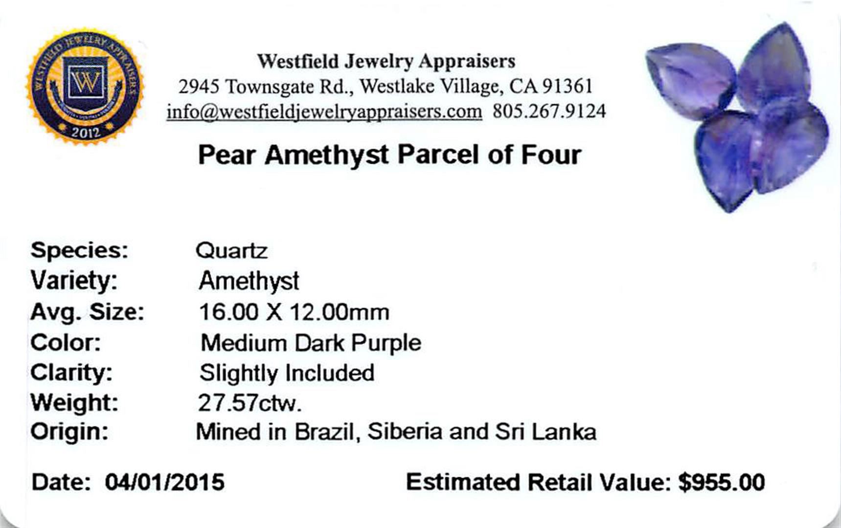 Four pear mixed cut natural amethysts exact total weight 27.57ct., clarity is slightly included, type II, medium dark, very slightly grayish, purple color, (GIA P 6/3), cut is good. Westfield Appraised at $955.00.