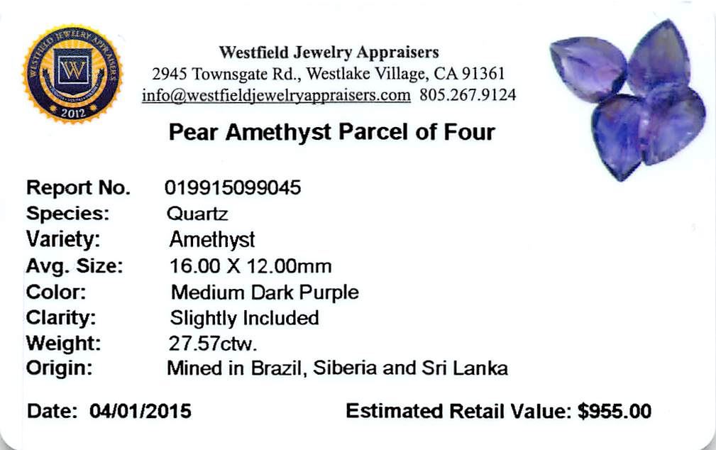 Four pear mixed cut natural amethysts exact total weight 27.57ct., clarity is slightly included, type II, medium dark, very slightly grayish, purple color, (GIA P 6/3), cut is good. Westfield Appraised at $955.00.