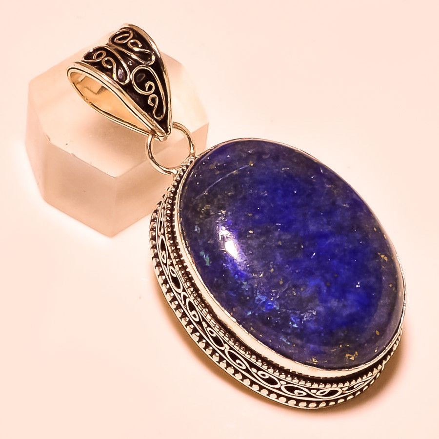 Beautiful 27.5ct natural blue lapis lazuli pendant. Excellent dark royal blue color with the highly desired gold pyrie highlights. Mounted in solid .925 sterling silver. 20 inches long. Total weight is 24.8 grams.
