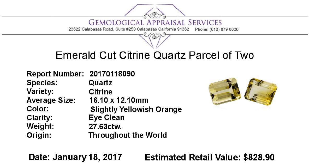 One natural emerald cut citrine quartz parcel of two with an exact weight of 27.63ctw., clarity is eye clean, slightly yellowish orange. Gemological Appraisals Services estimates the retail value at $828.9 GAS Appraised.