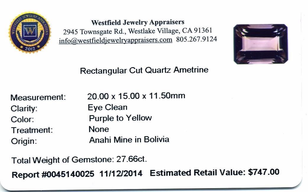 27.66ct. Rectangular Cut Quartz Ametrine Parcel. Westfield Appraised at $747.00.