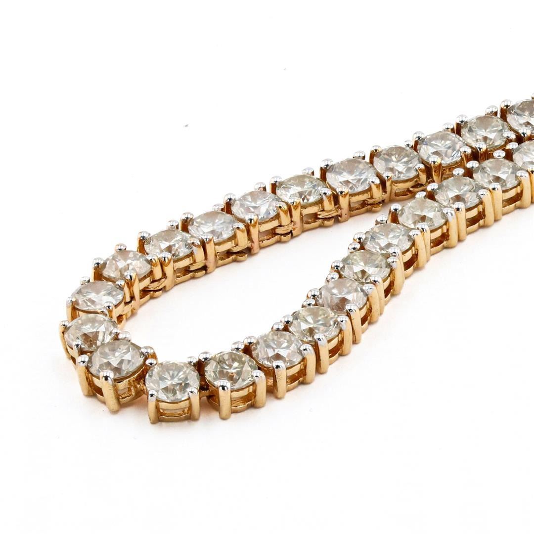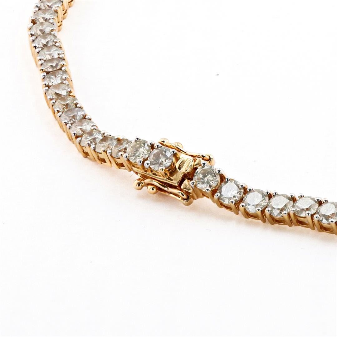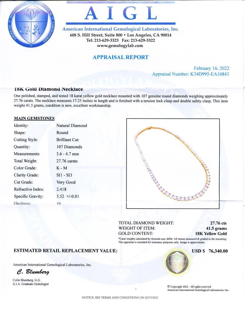27.76ctw Diamond 18K Yellow Gold Tennis Necklace. One polished, stamped, and tested 18 karat yellow gold necklace mounted with 107 genuine round diamonds weighing approximately 27.76 carats. The necklace measures 17.25 inches in length and is finished with a tension lock clasp and double safety clasp. This item weighs 41.5 grams, condition is new, excellent workmanship. MAIN GEMSTONES Identity: Natural Diamond Shape: Round Cutting Style: Brilliant Cut Quantity: 107 Diamonds Measurements: 3.6 - 4.7mm Total Weight: 27.76 carats Color Grade: K - M Clarity Grade: SI1 - SI3 Cut Grade: Very Good Refractive Index: 2.418 Specific Gravity: 3.52 +/- 0.01 Hardness: 10 TOTAL DIAMOND WEIGHT: 27.76 cts WEIGHT OF ITEM: 41.5 grams GOLD CONTENT: 18K Yellow Gold