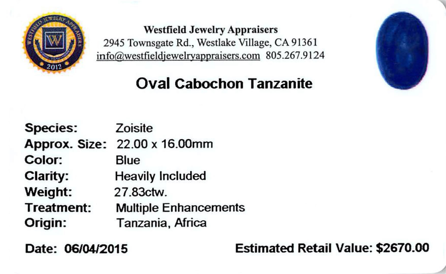 One oval cabochon cut natural tanzanite, measuring 21.00 x 15.00 x 9.00mm, exact weight 27.83ct., clarity is heavily included, type I, dark, moderately strong, blue color, (GIA B 7/4), cut is good. Transmitting light somewhat diffusely, transparent to translucent. Naturally occurring internal & external characteristics are present. Indications of heat treatment.