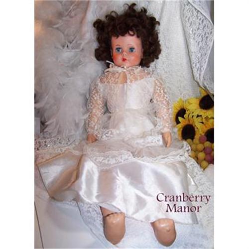 * this wonderful Bride doll comes to you from the Deluxe Reading Corporation and is made w/a vinyl head, a rubber body, sleepy eyes, dark brown and rooted hair - she is wearing a lovely wedding dress trimmed in lace w/a gorgeous application of makeup for her special day - all accented w/piercing blue eyes