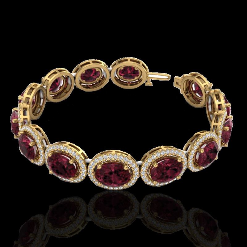 REF-360N2Y -22690 ---- 27 CTW Garnet & Micro Pave VS/SI Diamond Bracelet 10K Yellow Gold ---- Luxury Designer Brand Bracelet Appraised at $25,750 Certificate Number US22690  10k Yellow gold,  Bracelet Size is 7 1/2 Inches, Bracelet measuring approx.  1/2" X 7.5" , weighing in total approx. 22 grams. Made in the USA and is stamped 10k, Main stone 23 carat total weight containing 15 pieces of Saturated purplish Red color with AAA quality Oval shape cut Garnet , Stone #2 4 carat total weight containing 375 pieces of H-I color with  VS/SI quality Round shape cut Diamond