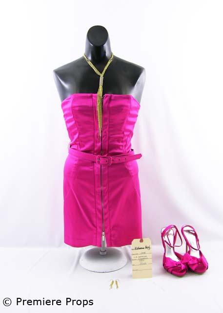 27 Dresses (2008) , this is Jane's (Katherine Heigl) screen worn "THINK PINK LA WEDDING" hot-pink strapless "Bebe" mini bridesmaid dress. This remarkable dress is one of the 27 that she wears throughout the movie. The outfit also includes a gold-colored chain necklace, a pair of dangling gold-chain earrings and a pair of hot-pink "Baker" open-toe shoes with 5" heels. The costume department's wardrobe tag is also included! An absolute must have for fans of the heartwarming romantic comedy,
