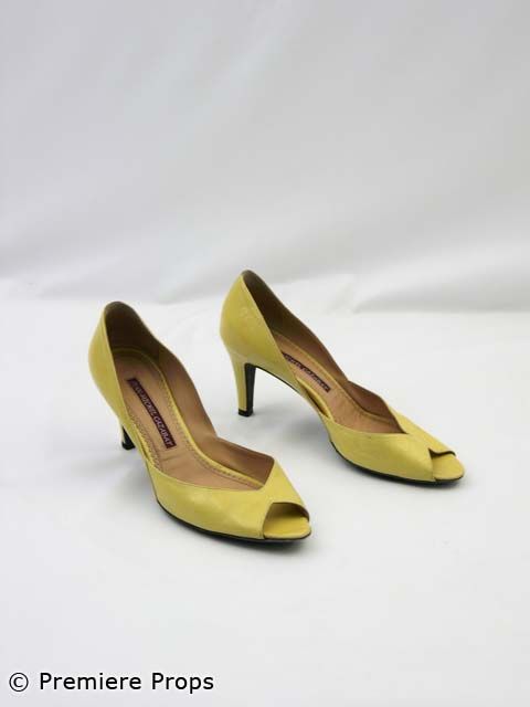 27 Dresses - Tess (Malin Akerman) dark denim "Dolce and Gabbana" halter minidress w/ back tie/ 2 front pockets/ leopard lining (size 38), metallic mint green "Nancy Gonzalez" clutch w/ embossed flowers on front, yellow leather "Jean-Michel Cazabat" peeptoe pumps (size 38.5) (includes wardrobe tag / screen worn)