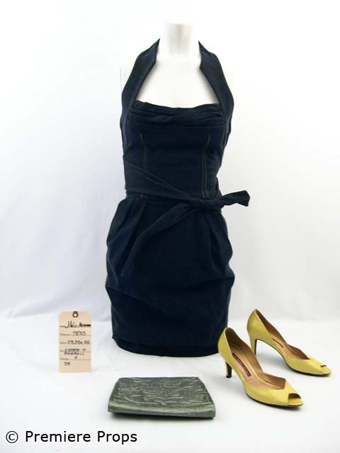 27 Dresses - Tess (Malin Akerman) dark denim "Dolce and Gabbana" halter minidress w/ back tie/ 2 front pockets/ leopard lining (size 38), metallic mint green "Nancy Gonzalez" clutch w/ embossed flowers on front, yellow leather "Jean-Michel Cazabat" peeptoe pumps (size 38.5) (includes wardrobe tag / screen worn)