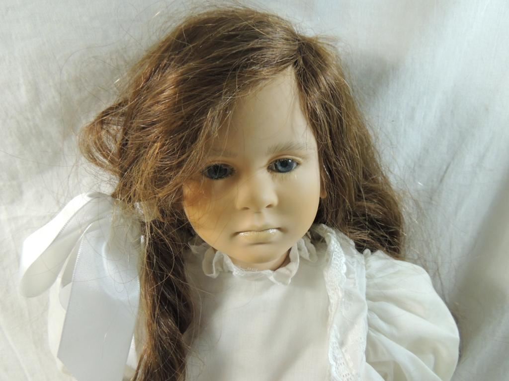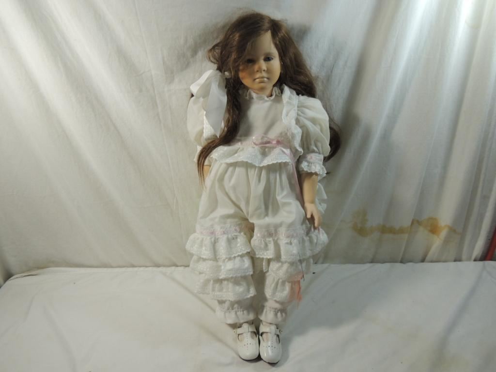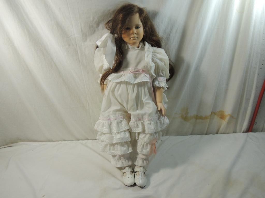 VINYL DOLL, GERMAN DOLL, COLLECTORS DOLL, WHITE DRESS, BROWN HAIR, AS SHOWN SEE PHOTO FOR MORE DETAILS.