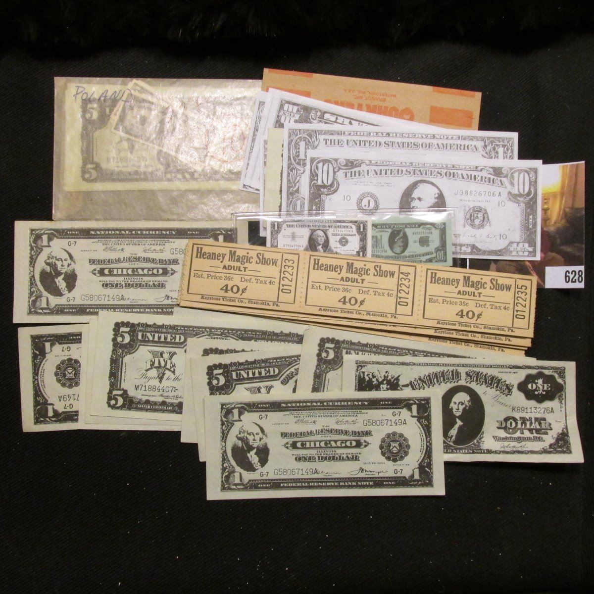 (27) "Heaney Magic Show Adult…40c" Tickets, still attached and unused; & a group of old miniaturized U.S. Currency facsimiles.