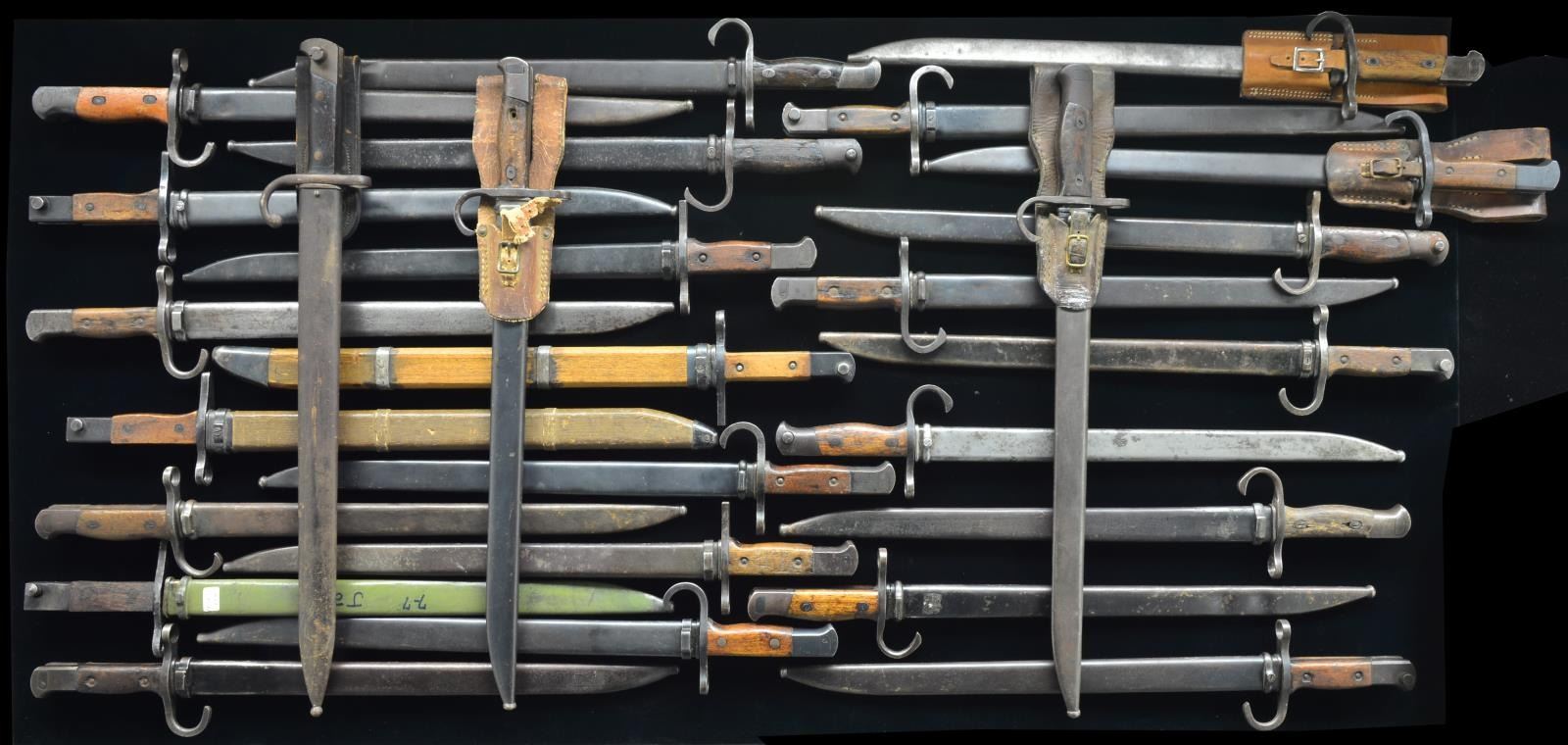 1) Japanese T30 modified US Enfield bayo mfg by Remington w/ scabbard & frog. 2) 4 T30 hooked crossguards w/ scabbards & frogs (1 frog is repro). 3) 16 T30 hooked guard w/ scabbards. 4) 3 T30 straight guards w/ scabbards. 5) 3 T30 late war last ditch w/ scabbards (2 wood,1 metal). (02-14096/ZAL). $600-1,000.