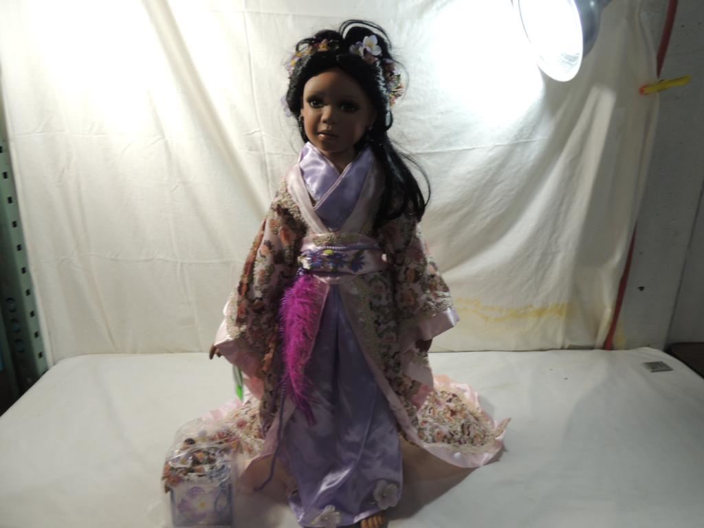 RETIRED DOLL, PARADISE GALLERY DOLLS JAPANESE CHINESE ASIAN FLORAL KIMONO BLACK HAIR WITH FLOWERS BROWN EYES. ON STAND. SATIN DRESS. LANTERN NEW AS SHOWN SEE PHOTO FOR MORE DETAILS.