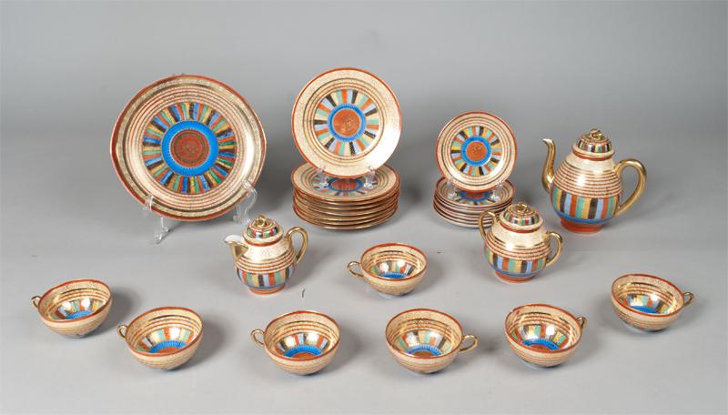 Includes large dinner plate, 8 salad plates, 8 saucers, 7 coffee cups, covered creamer, covered sugar and covered tea pot, all decorated with colorful floral and designed panels and heavily laden in gilt. Tallest 7.5" H, small rim chip to one cup.