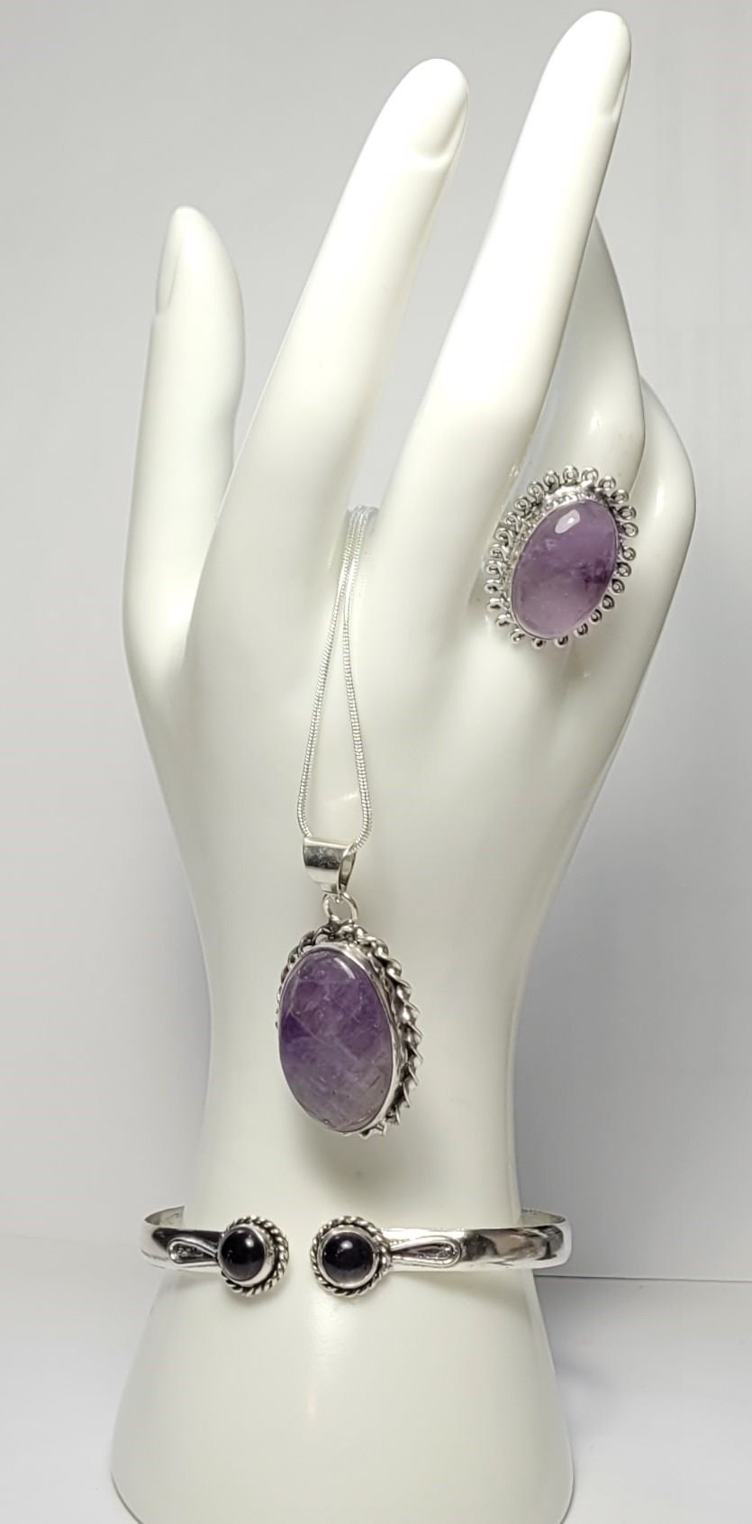 SIZE 8.25 RING STAMPED 925 & PENDANT ON 22" SNAKE CHAIN & BRACELET WITH STONES ON EACH END. JEWELERY