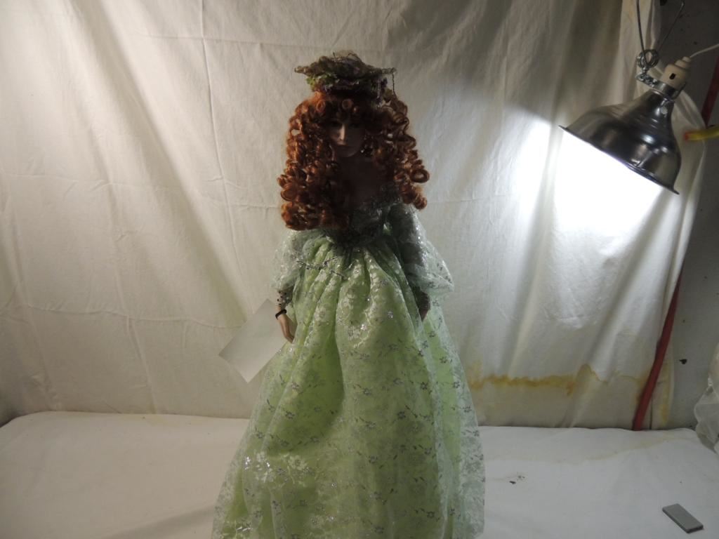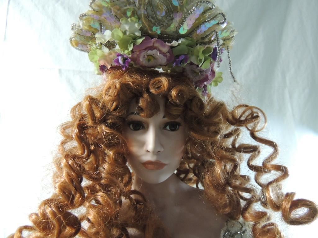 PORCELAIN DOLL TALL LACE DRESS, CURLY RED HAIR AND BROWN EYES. DESIGNER DOLL. ON STAND GOOD CONDITION. AS SHOWN SEE PHOTO FOR MORE DETAILS.