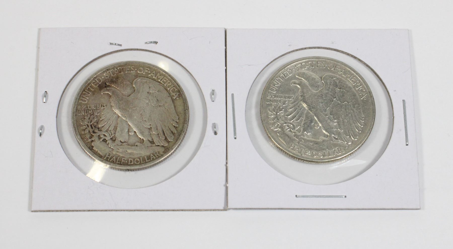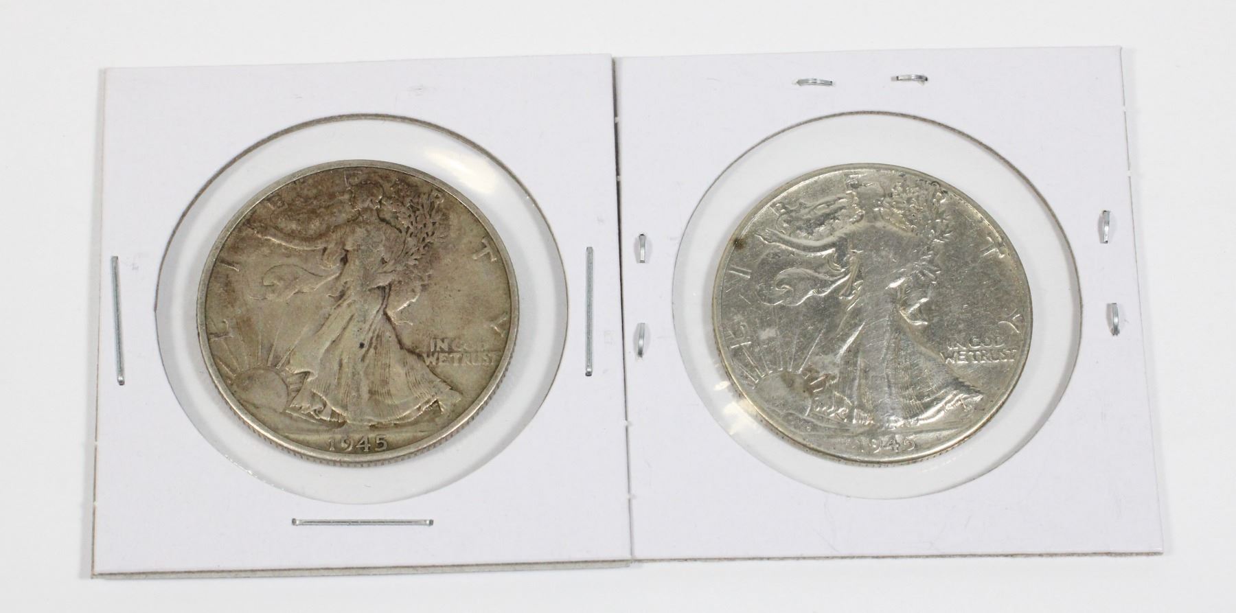 LOT OF 2 WW2 WORLD WAR TWO ERA 1945 HALF DOLLAR 50 CENTS FIFTY CENTS SILVER COIN WALKING LIBERTY UNITED STATES OF AMERICA US USA SILVER CURRENCY