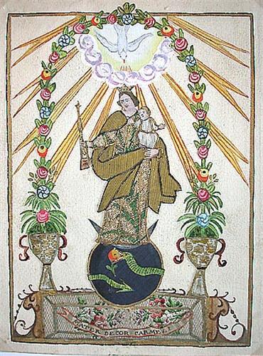 Une grande image habillée sur papier avec guirlande fleurie découpée et peinte (Mater Decor Carmeli).-- un canivet (S. Franciscus).
