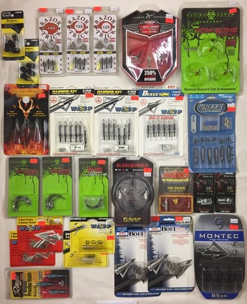 27 Packages Broadheads Plus ..., Bludgeon 125 Gr, Bludgeon 85 Gr, Razor Tricks 100 Gr, 2-Razor Tricks 125 Gr, F-15 100 Gr, Toxic Tom Bomb 125 Gr, VPA 3 Blade 190 Gr, 2-Hammer SST 85 Gr, Boss Bullet 75 Gr, Muzzy 75 Gr, 13 x Relpacement Packs, 2-Toxic Tom Bomb 125 Gr, Toxic Tom Bomb Extreme 100 Gr, NAP Blood Runner, Swhacker 100 Gr, 2-Grim Reaper X-Bow 125 Gr, 2-Sharp Shooter, 2-Jak Hammer, 2-Boltcutter, 2 x Practice Blades, Rage 3 Blade 100 Gr, Montec Pre Season 85 Gr