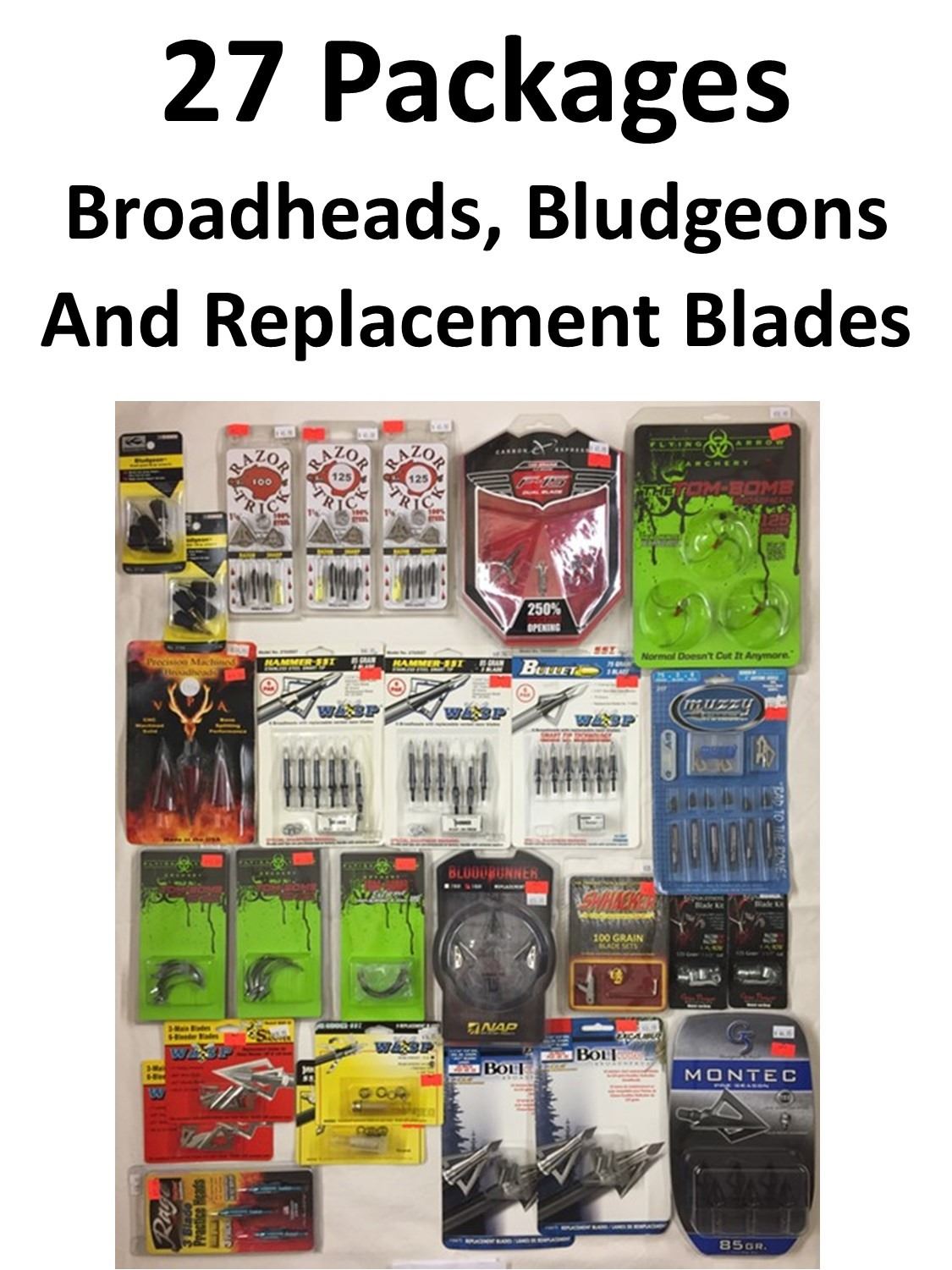 27 Packages Broadheads Plus ..., Bludgeon 125 Gr, Bludgeon 85 Gr, Razor Tricks 100 Gr, 2-Razor Tricks 125 Gr, F-15 100 Gr, Toxic Tom Bomb 125 Gr, VPA 3 Blade 190 Gr, 2-Hammer SST 85 Gr, Boss Bullet 75 Gr, Muzzy 75 Gr, 13 x Relpacement Packs, 2-Toxic Tom Bomb 125 Gr, Toxic Tom Bomb Extreme 100 Gr, NAP Blood Runner, Swhacker 100 Gr, 2-Grim Reaper X-Bow 125 Gr, 2-Sharp Shooter, 2-Jak Hammer, 2-Boltcutter, 2 x Practice Blades, Rage 3 Blade 100 Gr, Montec Pre Season 85 Gr