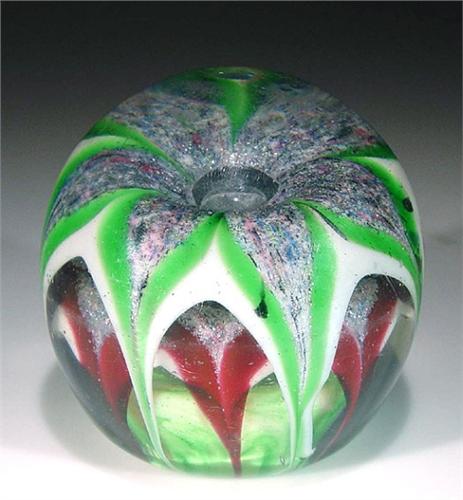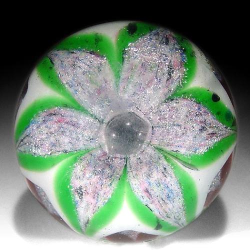 Antique miscellaneous flowers in a pot paperweight, containing a large upright silver, green, and white flower, over an upright silver, red, and white flower, in a green flower pot. The tips of the flowers' petals extend down to the base of the piece. Unpolished base. Diameter 3 1/2". Minor surface wear. NO RESERVE