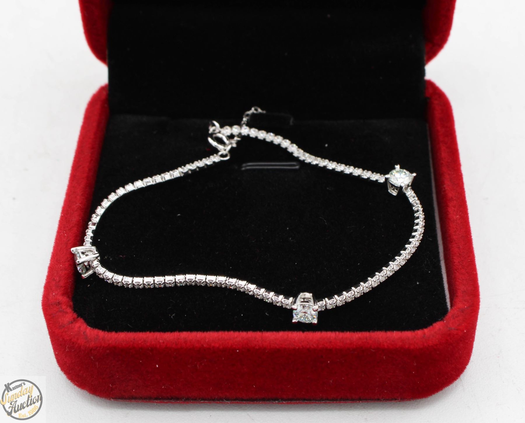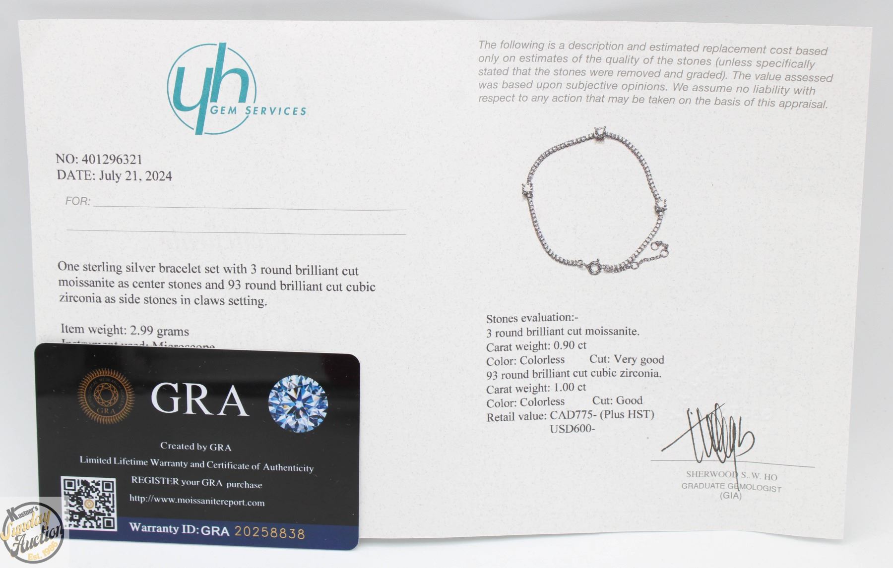 MOISSANITE STONES WEIGHING 0.90 CT TW VVS D COLOR WITH 93 ROUND BRILLIANT CUT CUBIC ZIRCONIA SET IN 4 CLAW HEADS SET IN 925 SILVER BRACELET RETAIL VALUE $775.00 **ALL ITEMS MUST BE REMOVED BY 5PM SATURDAY, JUNE 14TH 2025. ALL REMAINING ITEMS WILL BE SUBJECT TO A $6.00 PER DAY STORAGE CHARGE. ANY ITEMS REMAINING AFTER MONDAY, JUNE 30TH, 2025 WILL BE CONSIDERED FORFEITED. NO REFUNDS WILL BE ISSUED FOR FORFEITED ITEMS. TO SCHEDULE A PICK UP APPOINTMENT CLICK HERE
