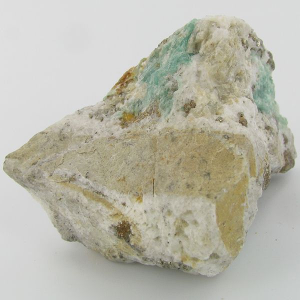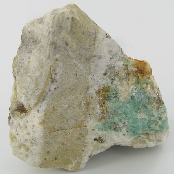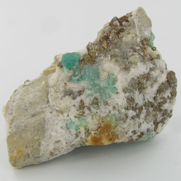 Excellent specimen with pyrite crystals and small emerald crystal vein on base material