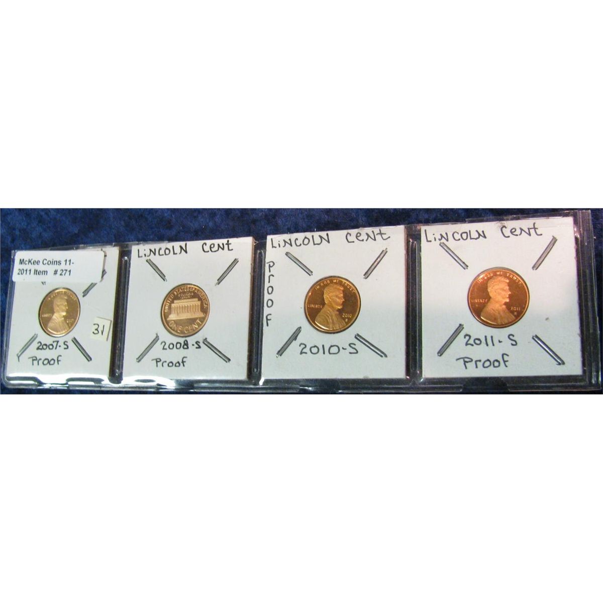 271. 2007 S Proof, 2008 S Proof, 2010 S Proof, & 2011 S Proof Cents.