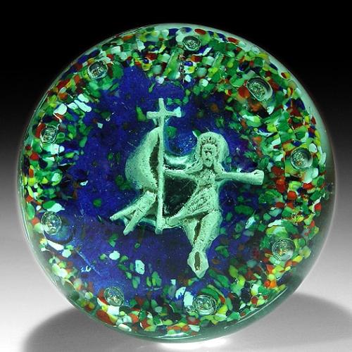 Sulphide green-tinted Joan of Arc paperweight, with an unusual sulphide of the French maiden, holding a banner, on speckled blue, green, red, yellow, and white ground, encircled by a spaced ring of small bubbles. Diameter 3 1/2". Minor surface wear. NO RESERVE
