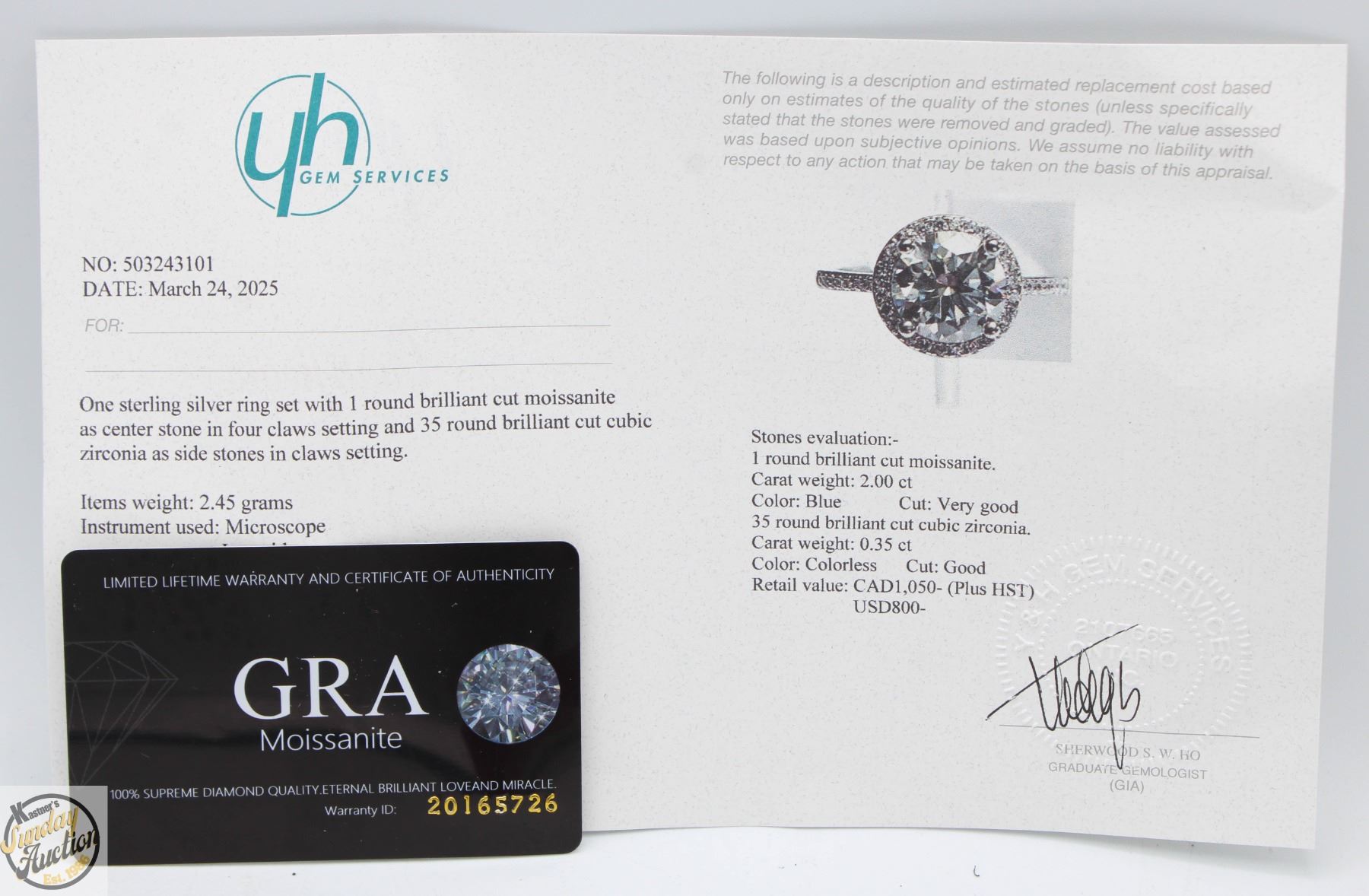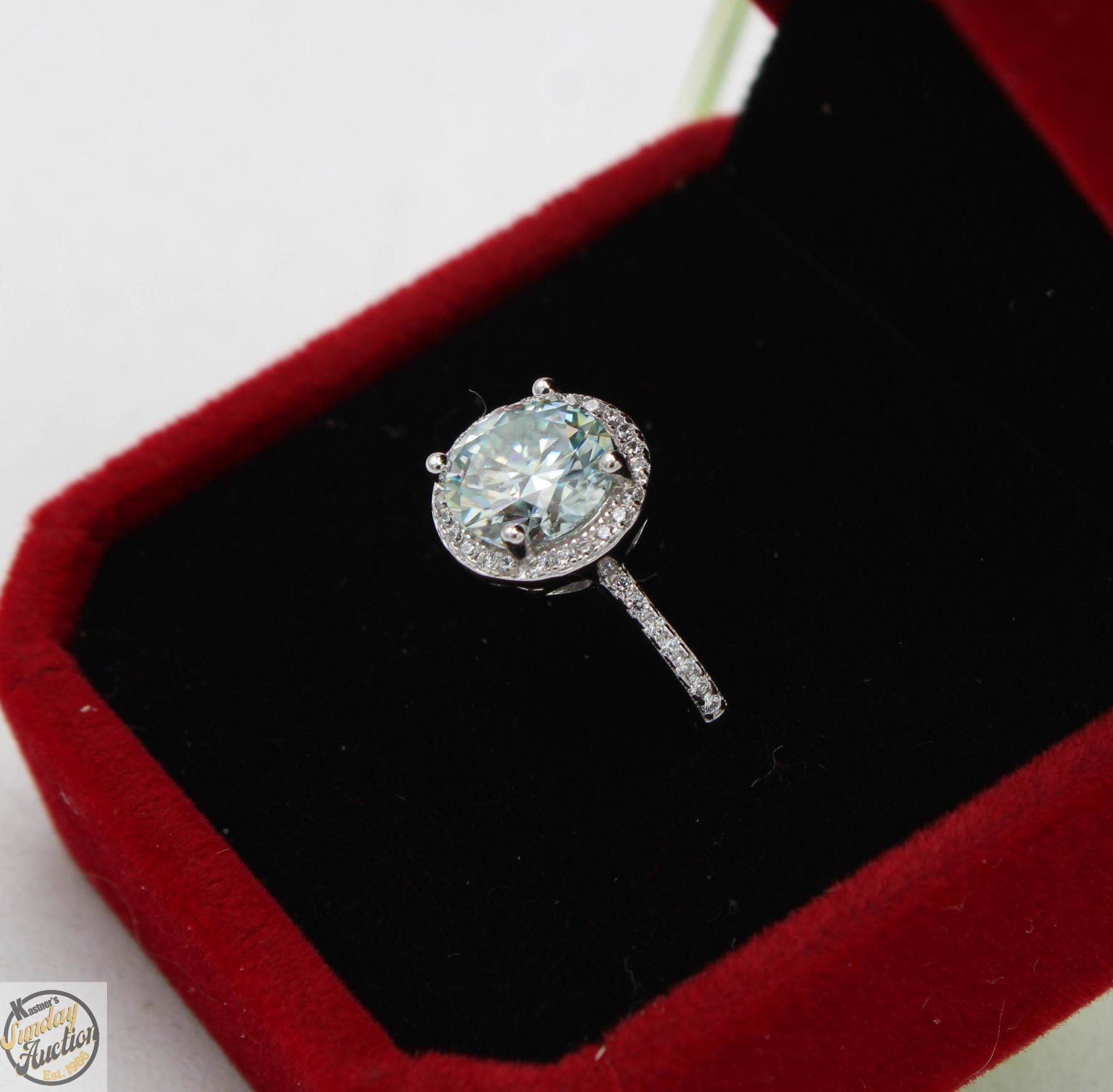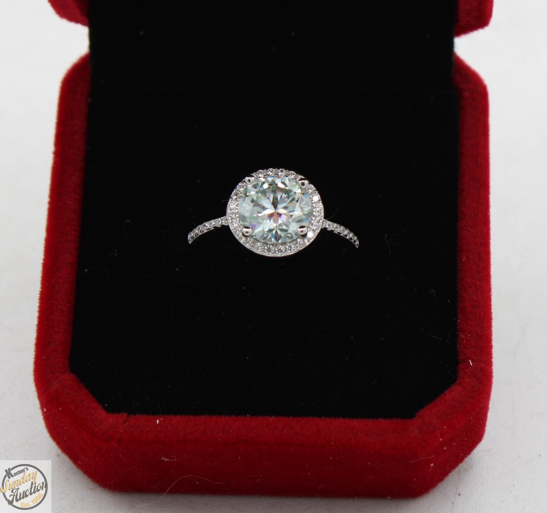 MOISSANITE STONE VVS D COLOR WITH 35 ROUND BRILLIANT CUT CUBIC ZIRCONIA SET IN ROUND HALO AND SHANKS SET IN 925 SILVER RING SIZE ADJUSTABLE RETAIL VALUE $1,050.00 **ALL ITEMS MUST BE REMOVED BY 5PM SATURDAY, JUNE 28th 2025. ALL REMAINING ITEMS WILL BE SUBJECT TO A $6.00 PER DAY STORAGE CHARGE. ANY ITEMS REMAINING AFTER MONDAY, JULY 14TH 2025 WILL BE CONSIDERED FORFEITED. NO REFUNDS WILL BE ISSUED FOR FORFEITED ITEMS. TO SCHEDULE A PICK UP APPOINTMENT CLICK HERE