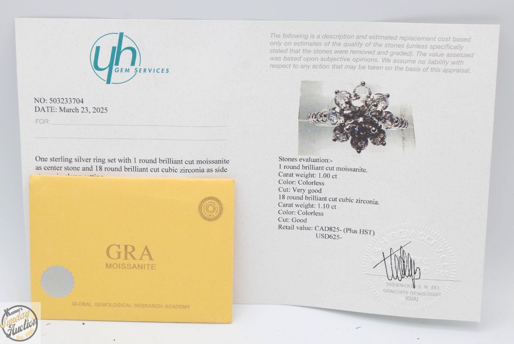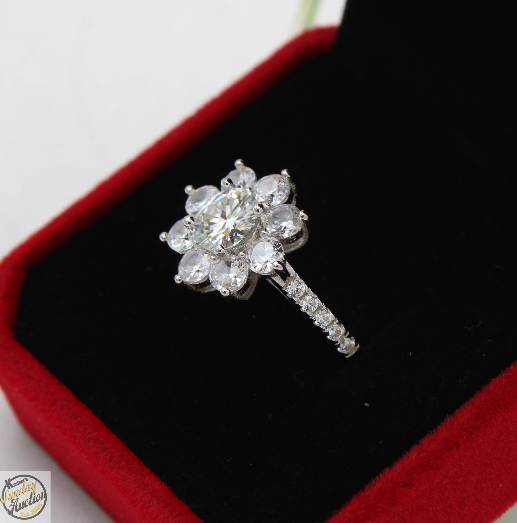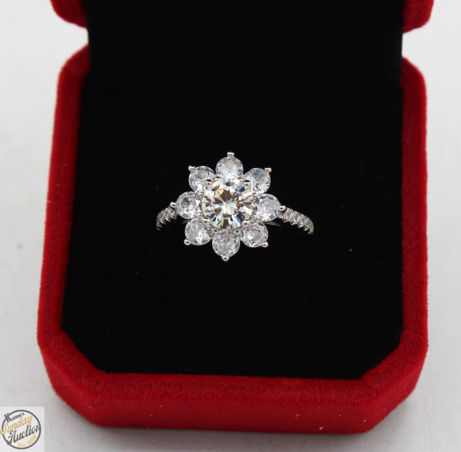 MOISSANITE STONE VVS D COLOR WITH 18 ROUND BRILLIANT CUT CUBIC ZIRCONIA SET IN AROUND CENTER AND SET IN SHANKS SET IN 925 SILVER RING SIZE 7 RETAIL VALUE $825.00 **ALL ITEMS MUST BE REMOVED BY 5PM SATURDAY, JUNE 28th 2025. ALL REMAINING ITEMS WILL BE SUBJECT TO A $6.00 PER DAY STORAGE CHARGE. ANY ITEMS REMAINING AFTER MONDAY, JULY 14TH 2025 WILL BE CONSIDERED FORFEITED. NO REFUNDS WILL BE ISSUED FOR FORFEITED ITEMS. TO SCHEDULE A PICK UP APPOINTMENT CLICK HERE