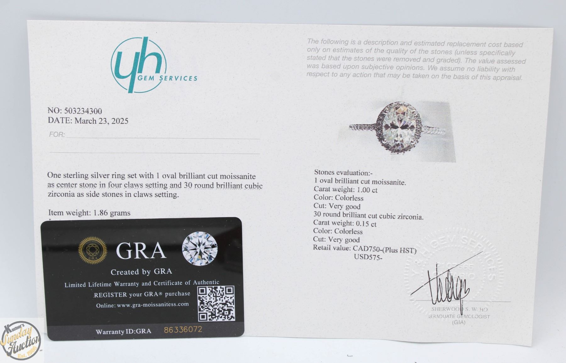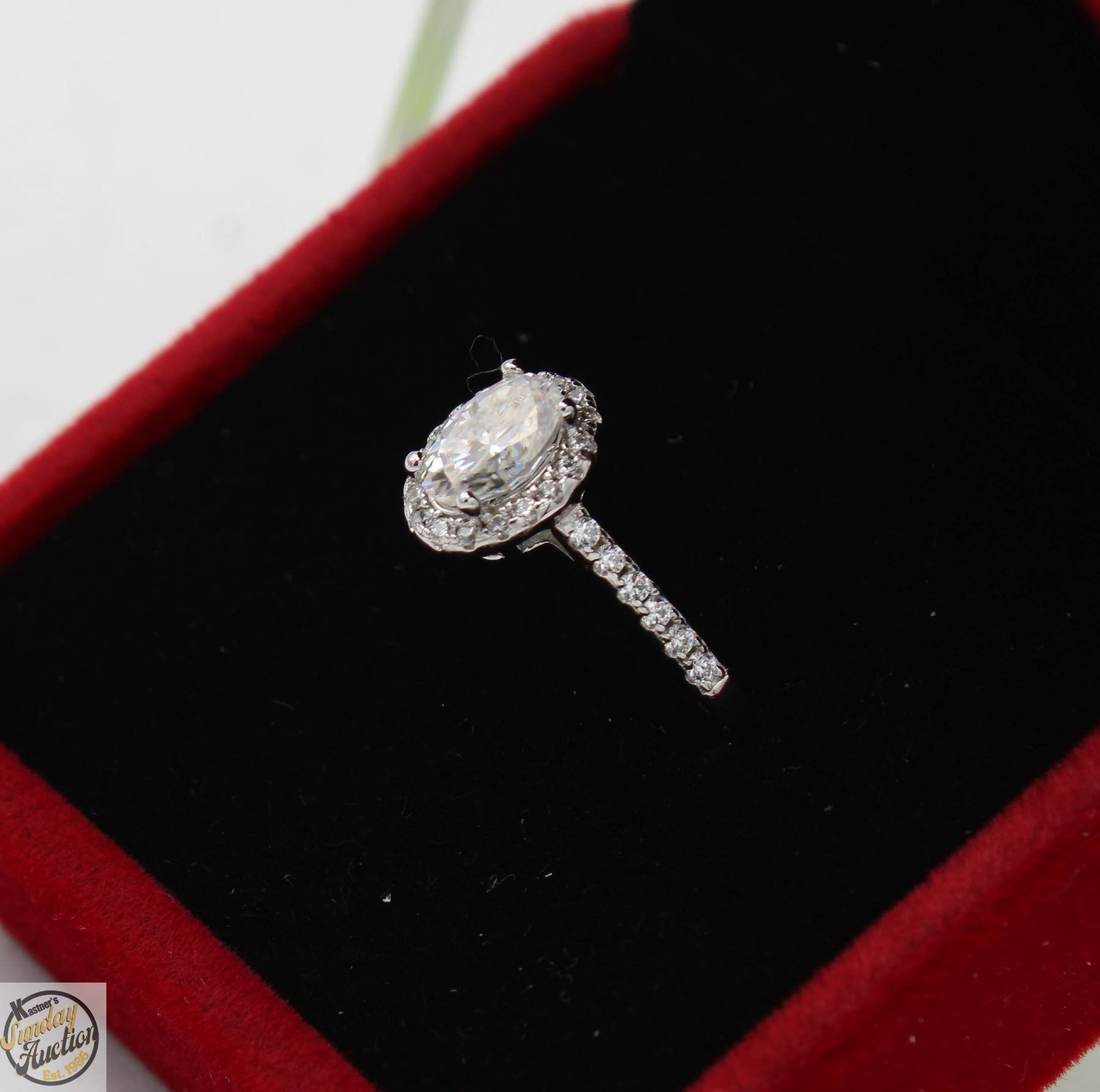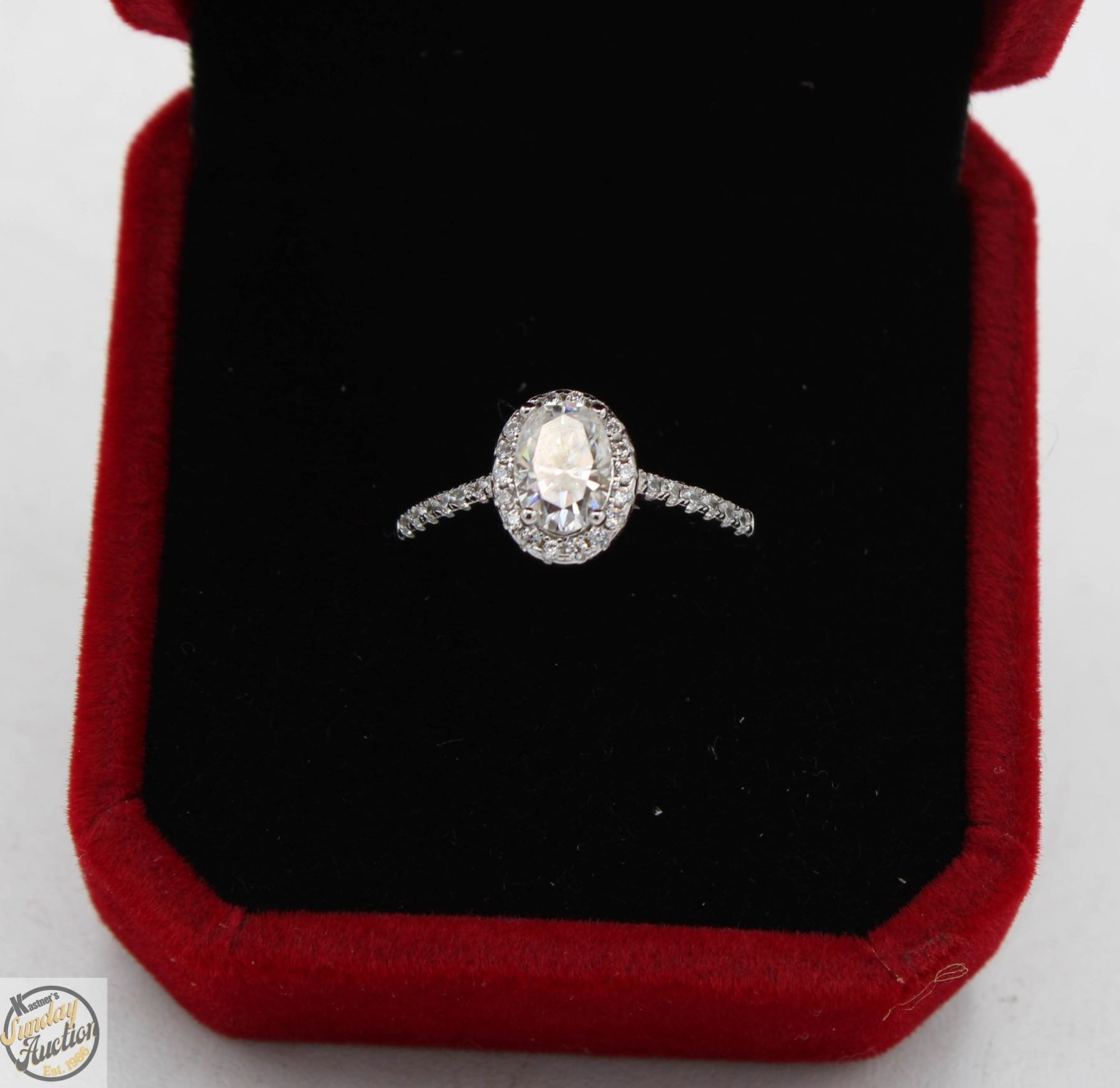 MOISSANITE STONE VVS D COLOR WITH 30 ROUND BRILLIANT CUT CUBIC ZIRCONIA SET IN OVAL HALO AND SET IN SHANKS SET IN 925 SILVER RING SIZE 6.5 RETAIL VALUE $825.00 **ALL ITEMS MUST BE REMOVED BY 5PM SATURDAY, JUNE 28th 2025. ALL REMAINING ITEMS WILL BE SUBJECT TO A $6.00 PER DAY STORAGE CHARGE. ANY ITEMS REMAINING AFTER MONDAY, JULY 14TH 2025 WILL BE CONSIDERED FORFEITED. NO REFUNDS WILL BE ISSUED FOR FORFEITED ITEMS. TO SCHEDULE A PICK UP APPOINTMENT CLICK HERE