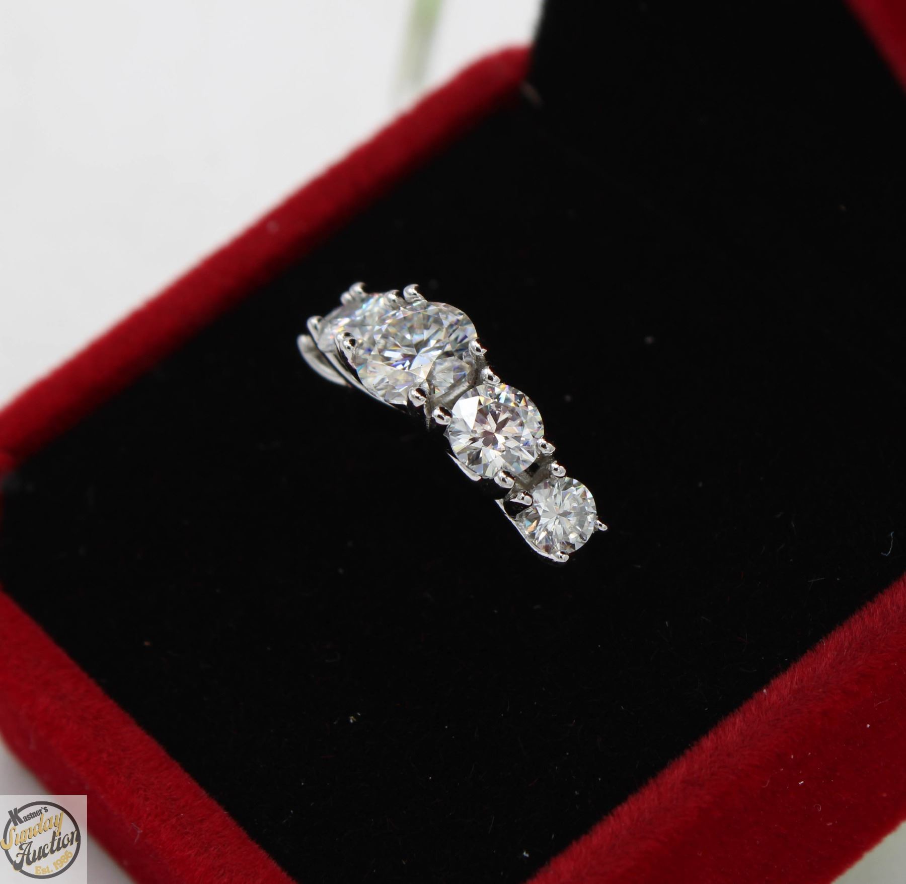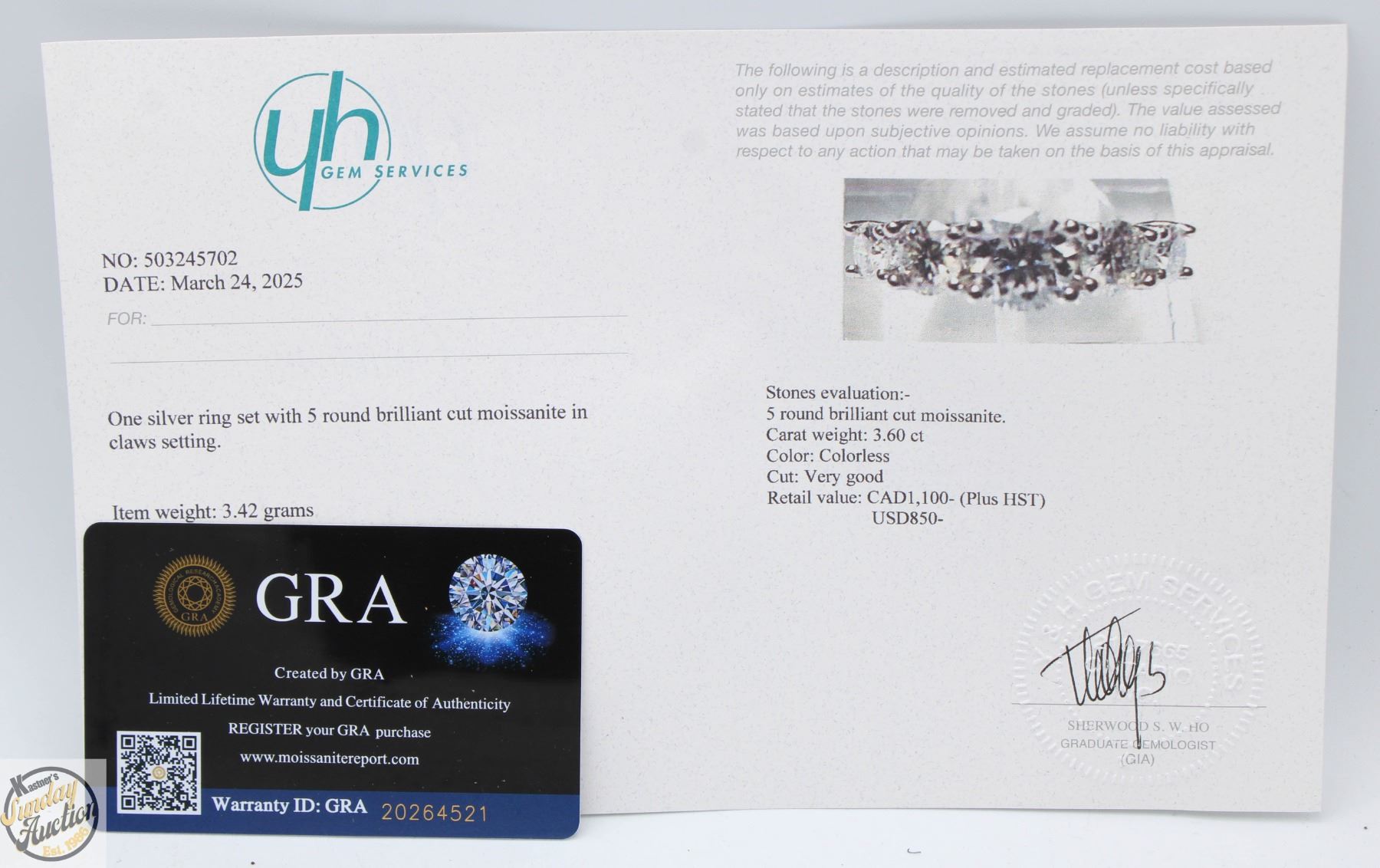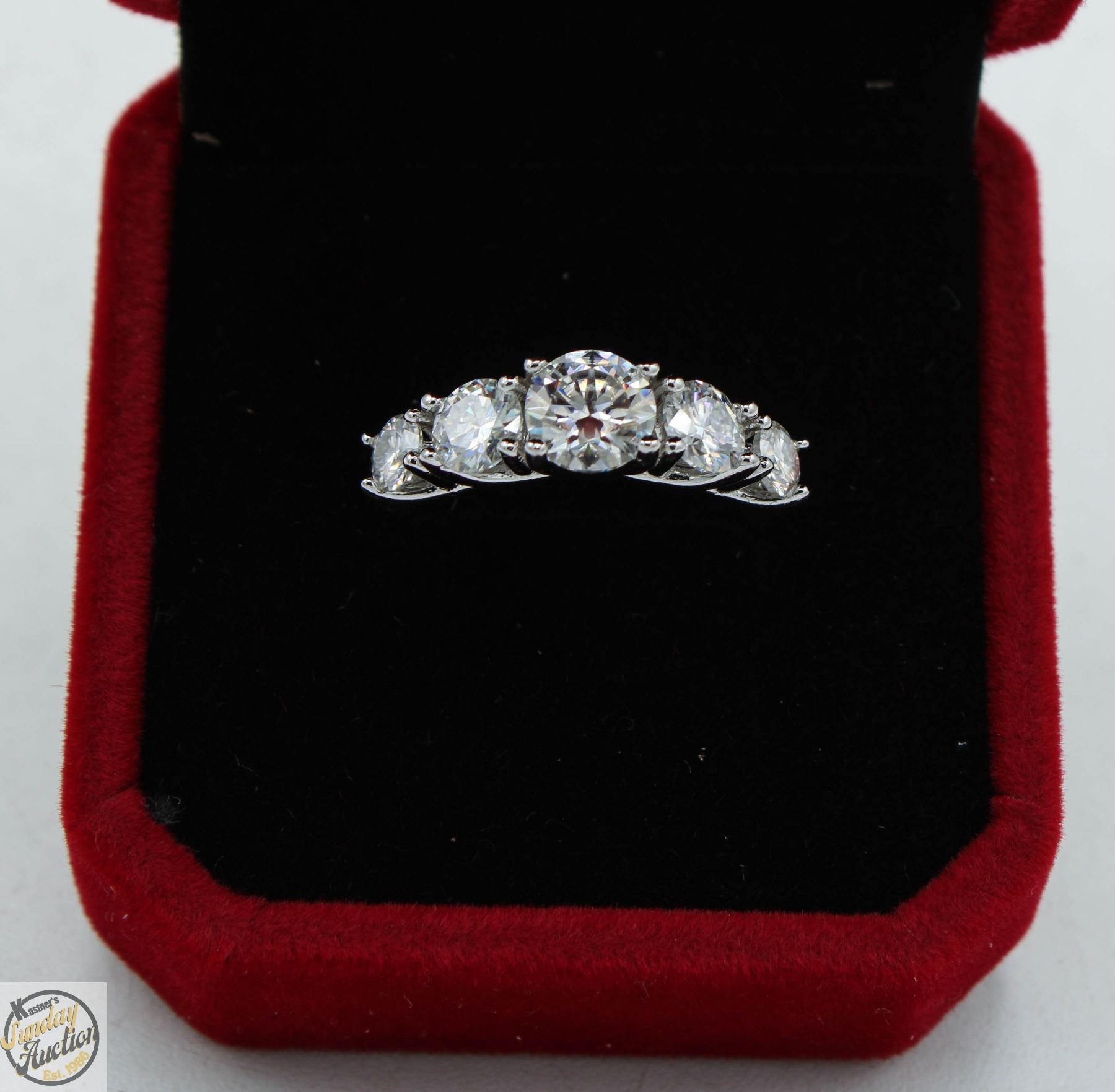 MOISSANITE STONES VVS D COLOR SET WITH LARGER MOISSANITE SET IN CENTER WITH GRADUATING DOWN IN SIZE ON EITHER SIDE SET IN 925 SILVER RING SIZE 7 RETAIL VALUE $1,100.00 **ALL ITEMS MUST BE REMOVED BY 5PM SATURDAY, JUNE 28th 2025. ALL REMAINING ITEMS WILL BE SUBJECT TO A $6.00 PER DAY STORAGE CHARGE. ANY ITEMS REMAINING AFTER MONDAY, JULY 14TH 2025 WILL BE CONSIDERED FORFEITED. NO REFUNDS WILL BE ISSUED FOR FORFEITED ITEMS. TO SCHEDULE A PICK UP APPOINTMENT CLICK HERE