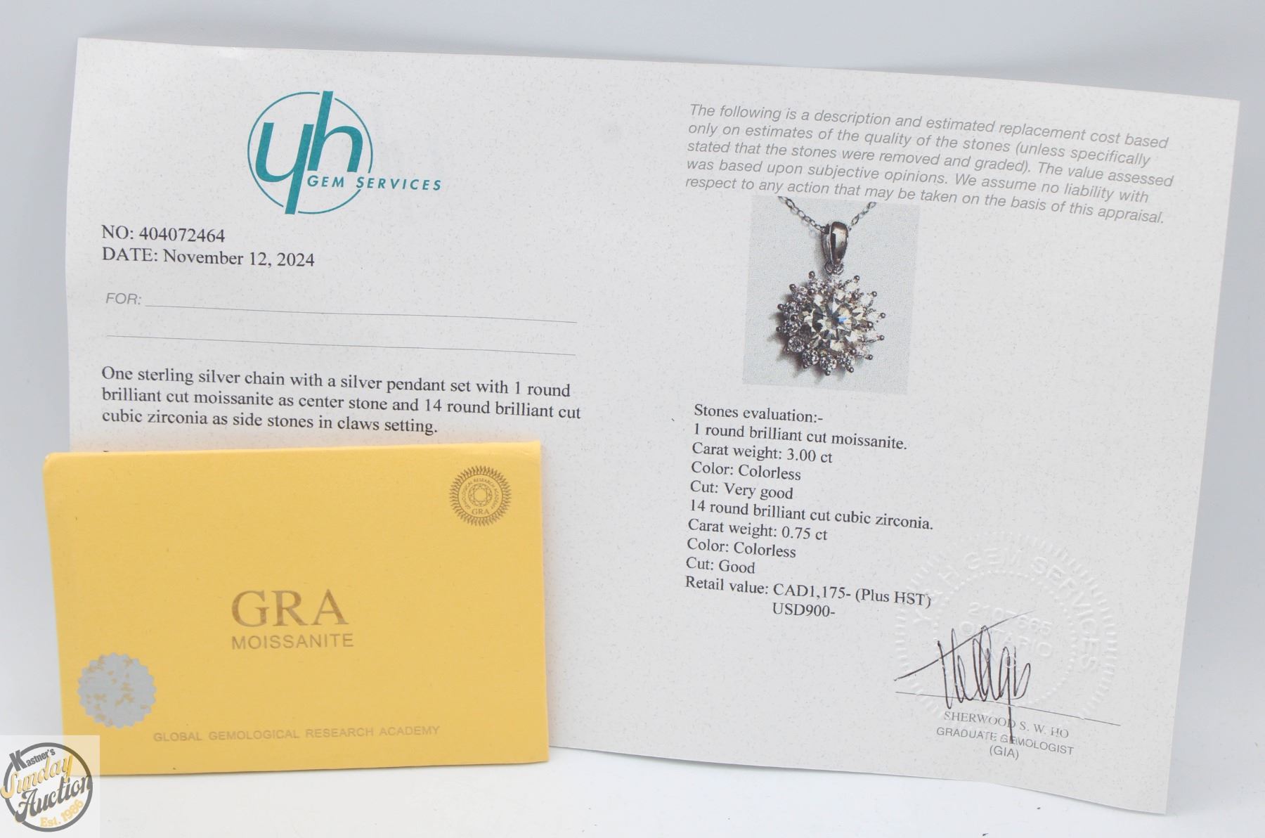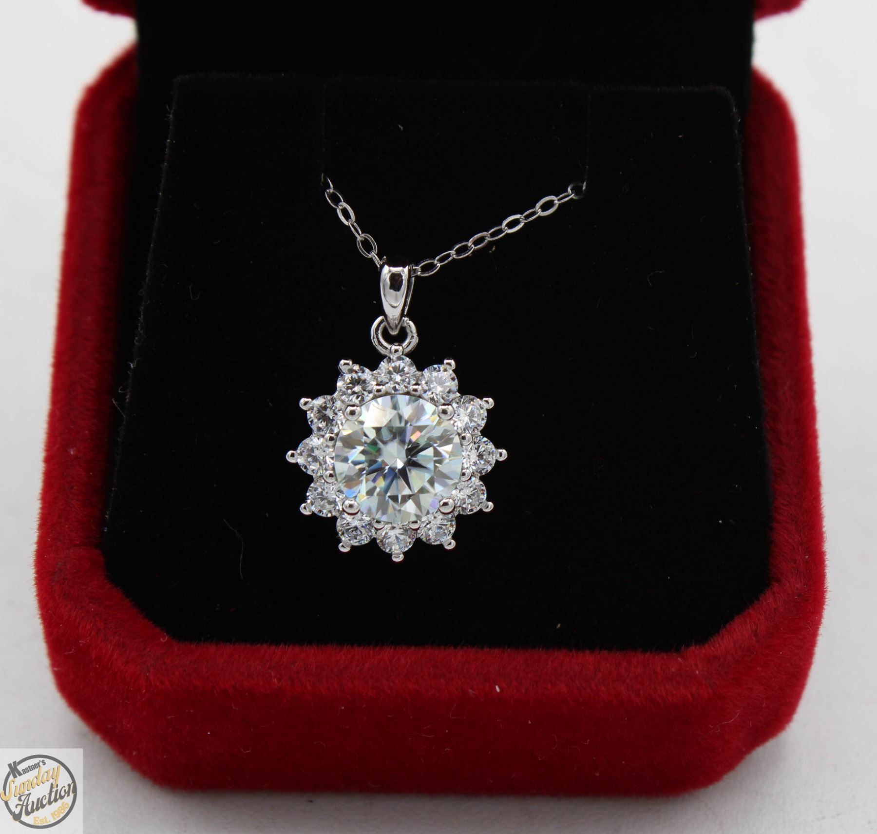 MOISSANITE STONES VVS D COLOR WITH 14 ROUND BRILLIANT CUT CUBIC ZIRCONIA SET AROUND CENTER SET IN 925 SILVER PENDANT RETAIL VALUE $1,175.00 **ALL ITEMS MUST BE REMOVED BY 5PM SATURDAY, JUNE 28th 2025. ALL REMAINING ITEMS WILL BE SUBJECT TO A $6.00 PER DAY STORAGE CHARGE. ANY ITEMS REMAINING AFTER MONDAY, JULY 14TH 2025 WILL BE CONSIDERED FORFEITED. NO REFUNDS WILL BE ISSUED FOR FORFEITED ITEMS. TO SCHEDULE A PICK UP APPOINTMENT CLICK HERE