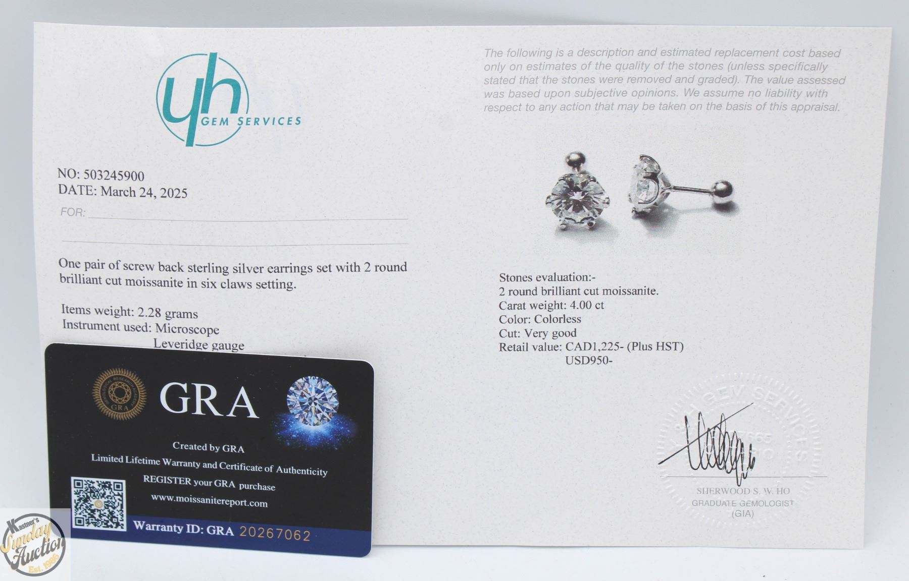 MOISSANITE STONES VVS D COLOR SET IN 6 CLAW FILAGREE HEAD SET IN 925 SILVER EARRINGS WITH SCREW BACKS RETAIL VALUE $1,225.00 **ALL ITEMS MUST BE REMOVED BY 5PM SATURDAY, JUNE 28th 2025. ALL REMAINING ITEMS WILL BE SUBJECT TO A $6.00 PER DAY STORAGE CHARGE. ANY ITEMS REMAINING AFTER MONDAY, JULY 14TH 2025 WILL BE CONSIDERED FORFEITED. NO REFUNDS WILL BE ISSUED FOR FORFEITED ITEMS. TO SCHEDULE A PICK UP APPOINTMENT CLICK HERE